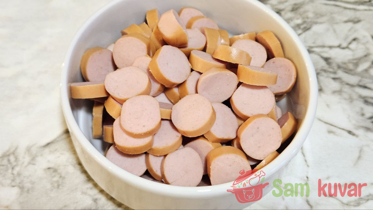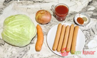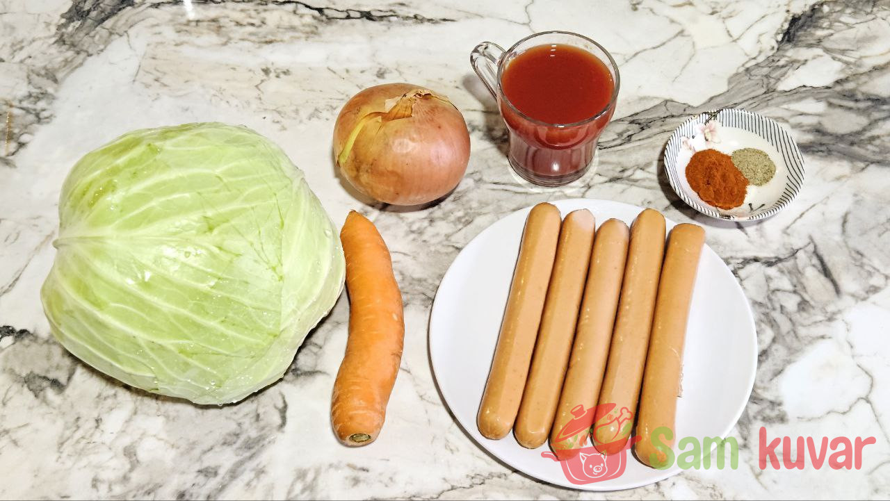 - Pripremite potrebne sastojke za pripremu bigosa sa viršlama.