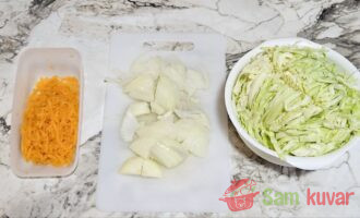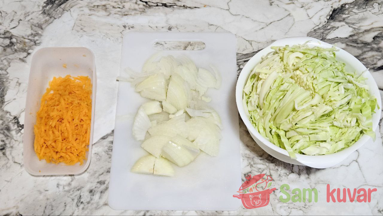 - Kupus iseckajte na trakice. Šargarepu izrendajte krupno. Luk iseckajte na četvrtine kolutova.