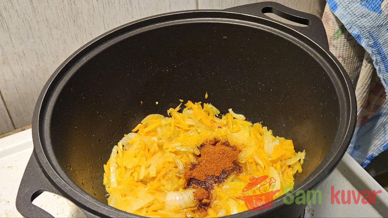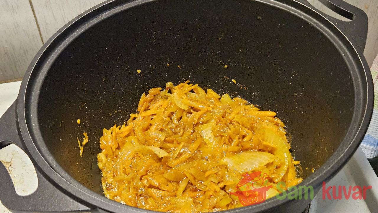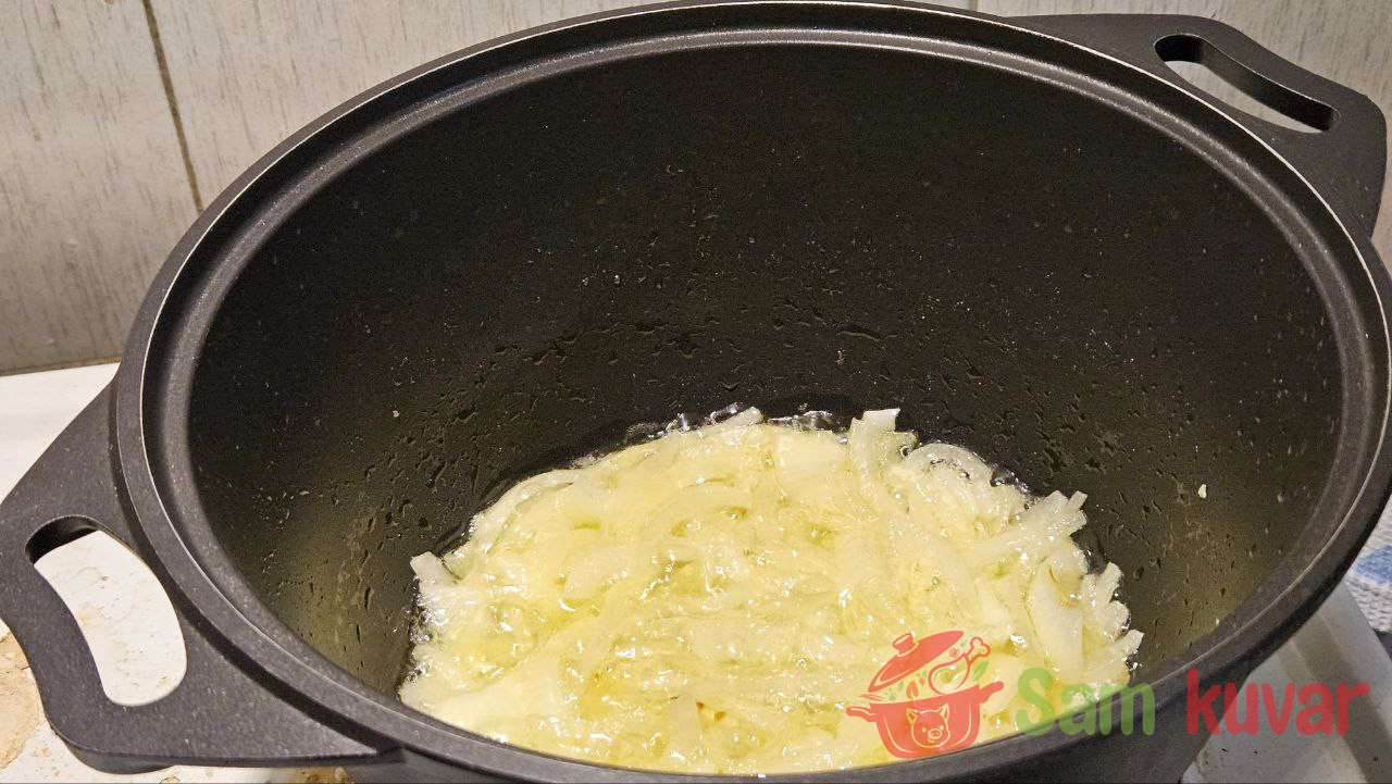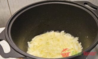 - U šerpi sa debelim dnom ispržite luk na jakoj vatri na malo ulja do zlatne boje.