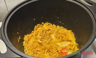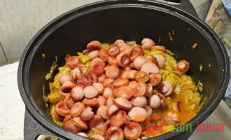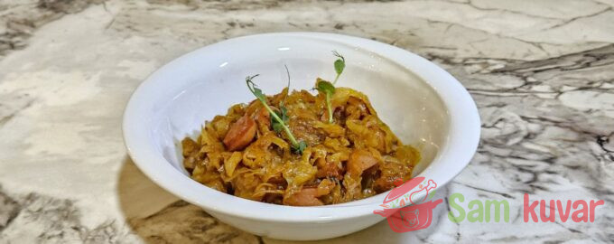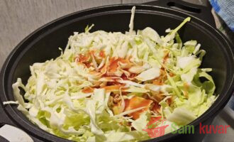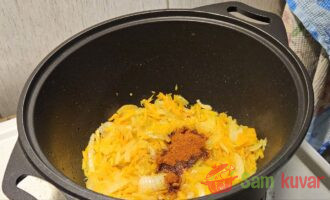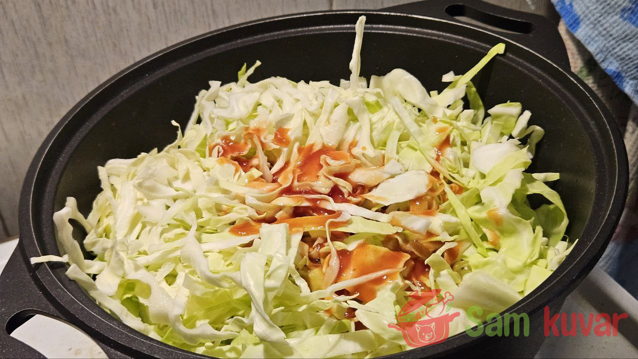 - Smanjite vatru, dodajte kupus, polovinu paradajz pirea i polovinu vode.