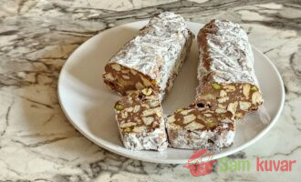Veoma jednostavan, ali ukusan desert u obliku kobasice. Orašasti plodovi i keks imitiraju masnoću, a
