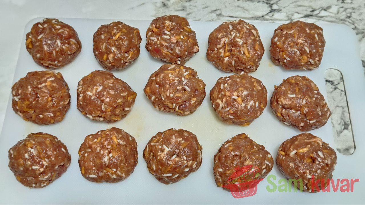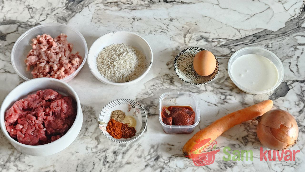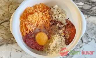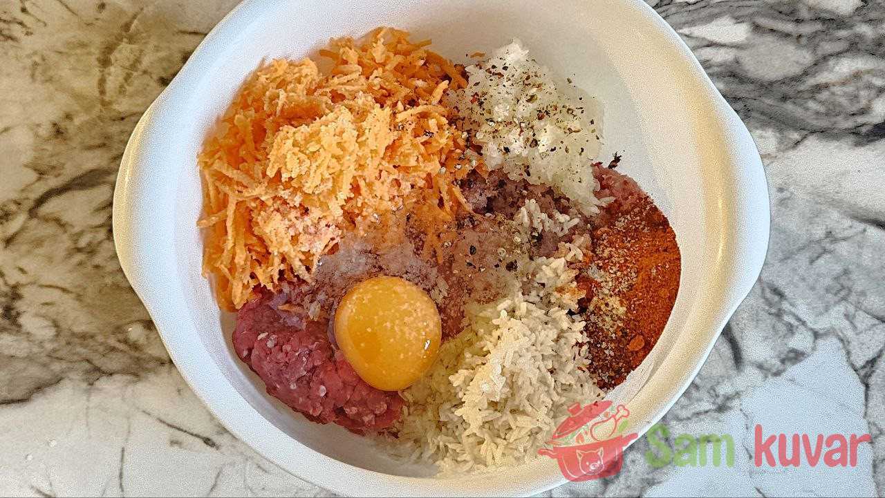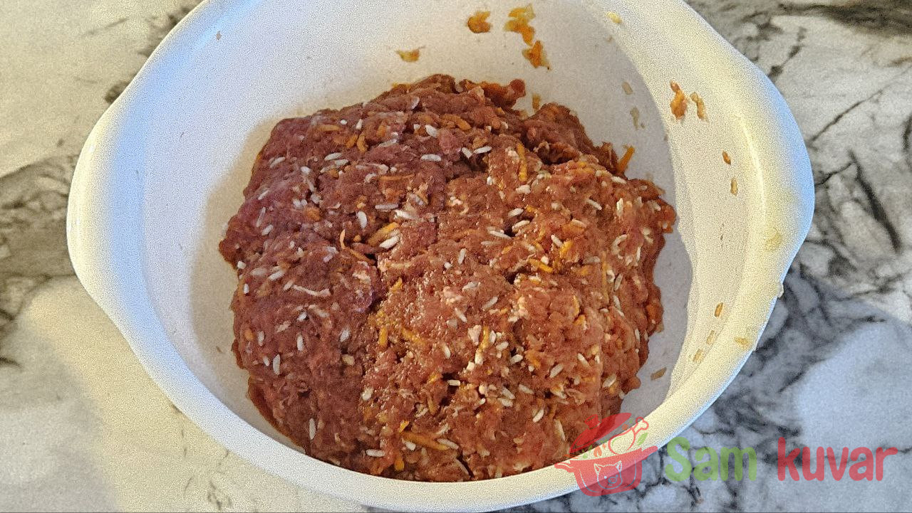 - U duboku posudu stavite mleveno meso, opran pirinač, izrendanu šargarepu i luk, sve začine, posolite, pobiberite i dodajte jaje.