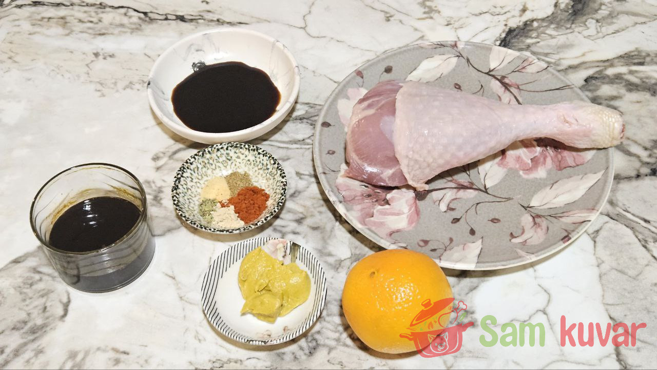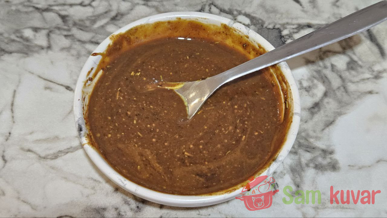 - Najpre pripremite marinadu. U manju činiju stavite senf, soja sos, med i sve suve začine. Posolite po ukusu i dobro promešajte.