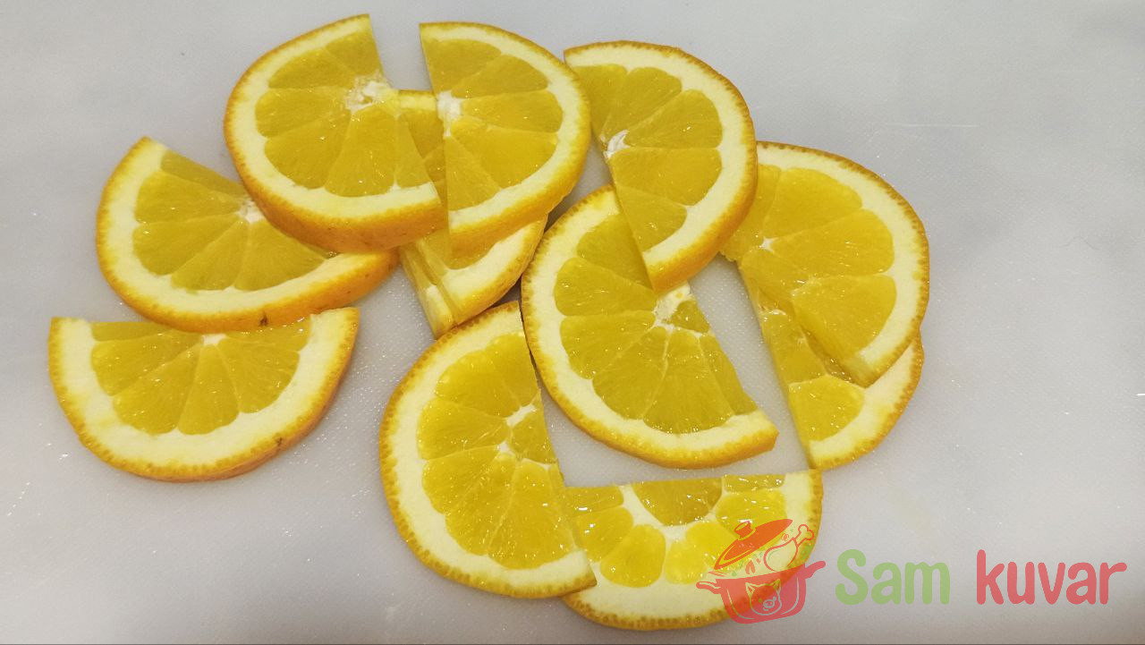 - Pomorandžu isecite na polukrugove.