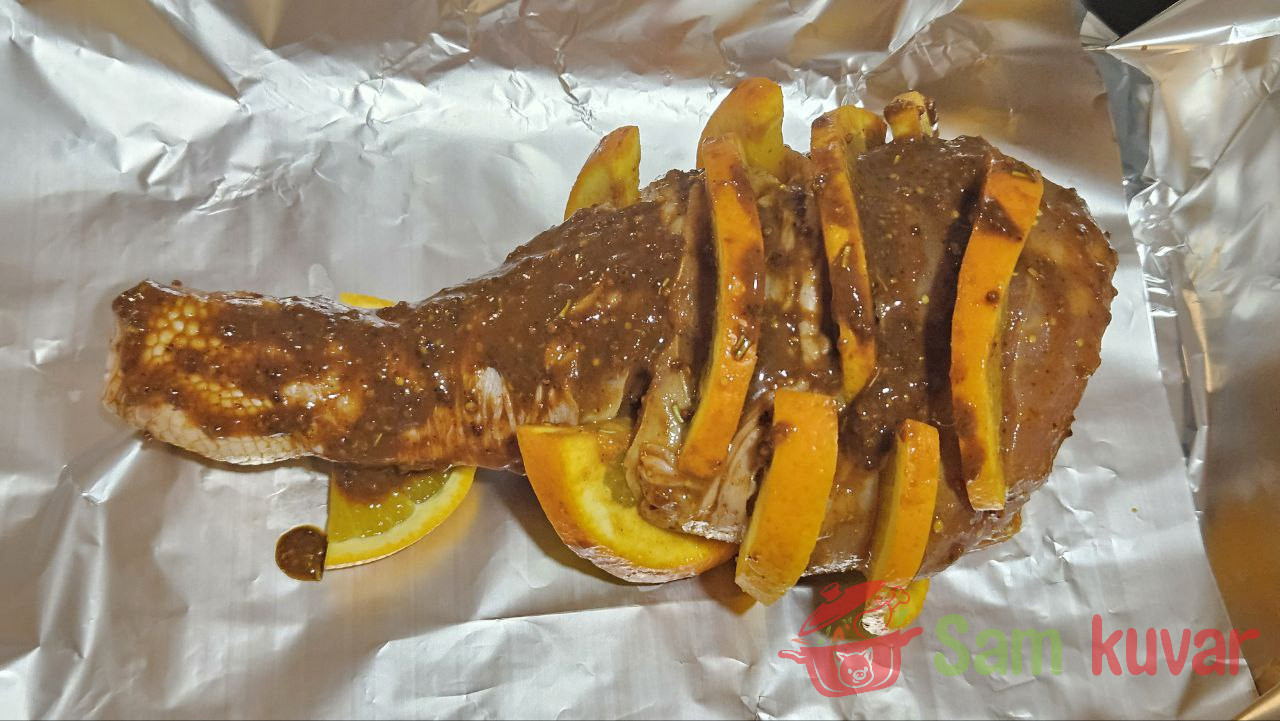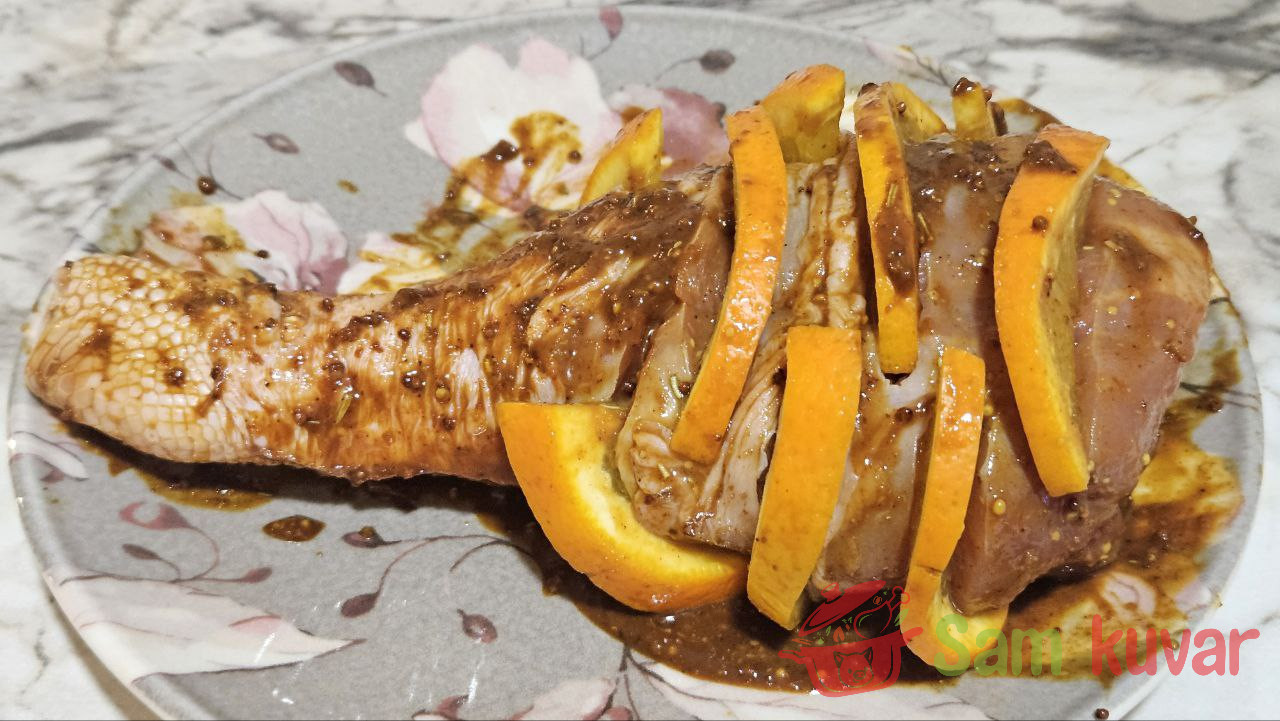- Na bataku ćuretine napravite duboke zareze sa tri strane. U svaki zarez stavite krišku pomorandže.