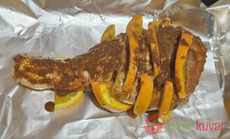 - Na aluminijumsku foliju rasporedite preostale kriške pomorandže, preko njih stavite batak ćuretine. Umotajte foliju i stavite u rernu zagrejanu na 200°C na 1 sat. Zatim smanjite temperaturu na 180°C i pecite još 1 sat. Nakon toga malo otvorite foliju i pecite još 30 minuta dok se ne stvori hrskava korica.