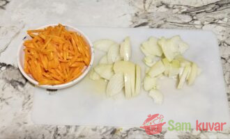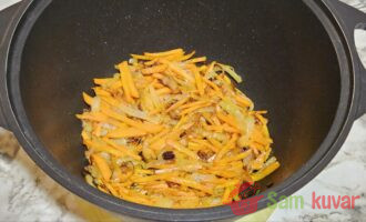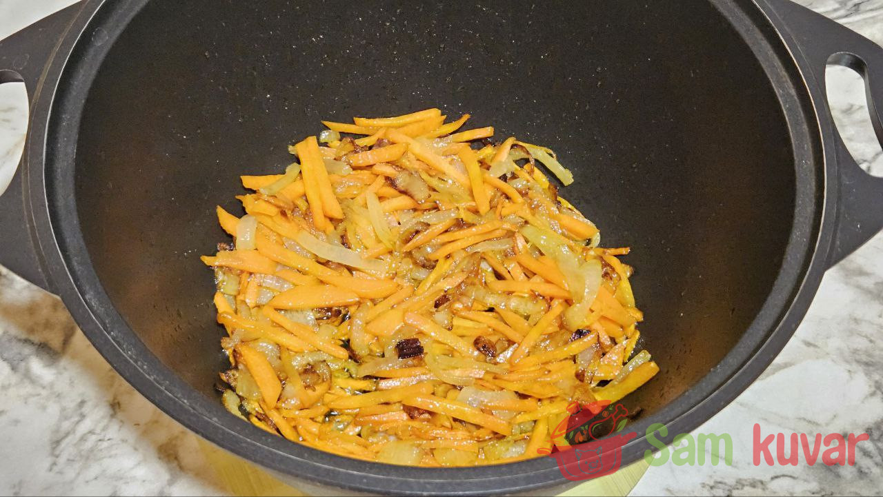 - U šerpi sa debelim dnom propržite luk na jakoj vatri sa malom količinom biljnog ulja dok ne dobije zlatnu boju. Zatim dodajte šargarepu i pržite još 5 minuta uz mešanje.