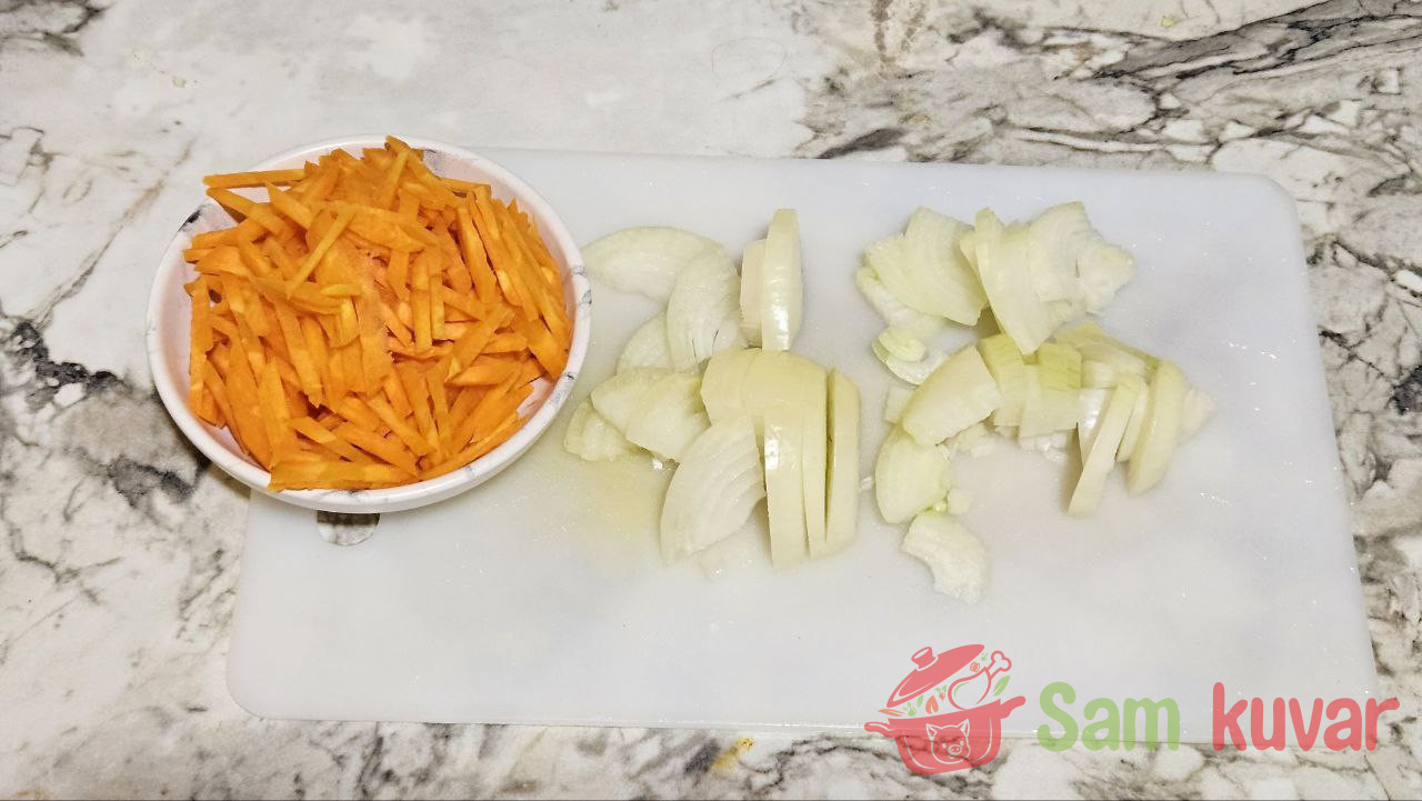 - Šargarepu isecite na štapiće. Crni luk isecite na četvrtine kolutova.