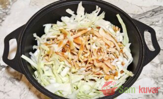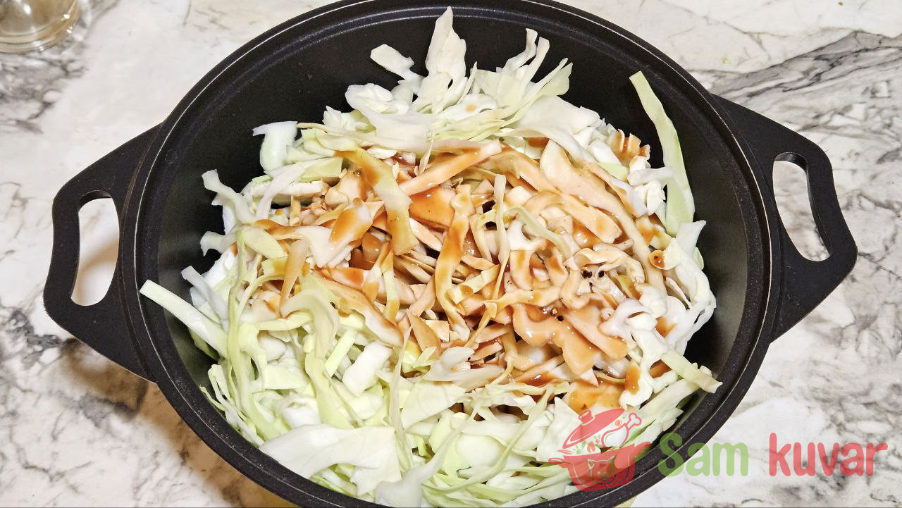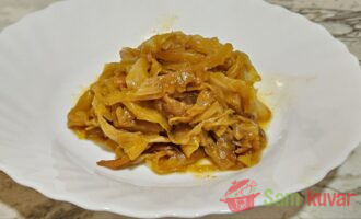 - Dodajte kupus, zatim paradajz pire i vodu. Dovedite do ključanja na jakoj vatri, zatim smanjite vatru i dinstajte kupus oko sat vremena. Kada kupus znatno smanji zapreminu, možete sve promešati.