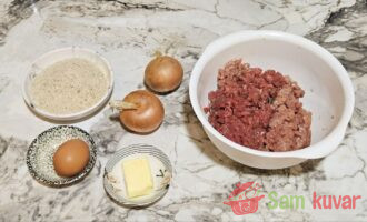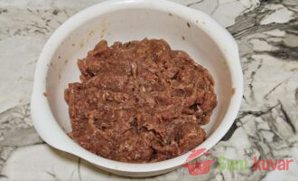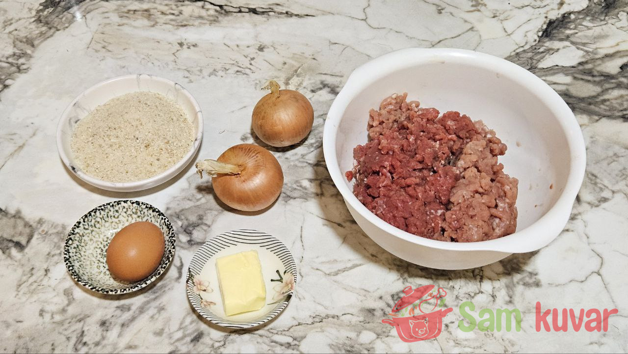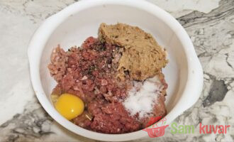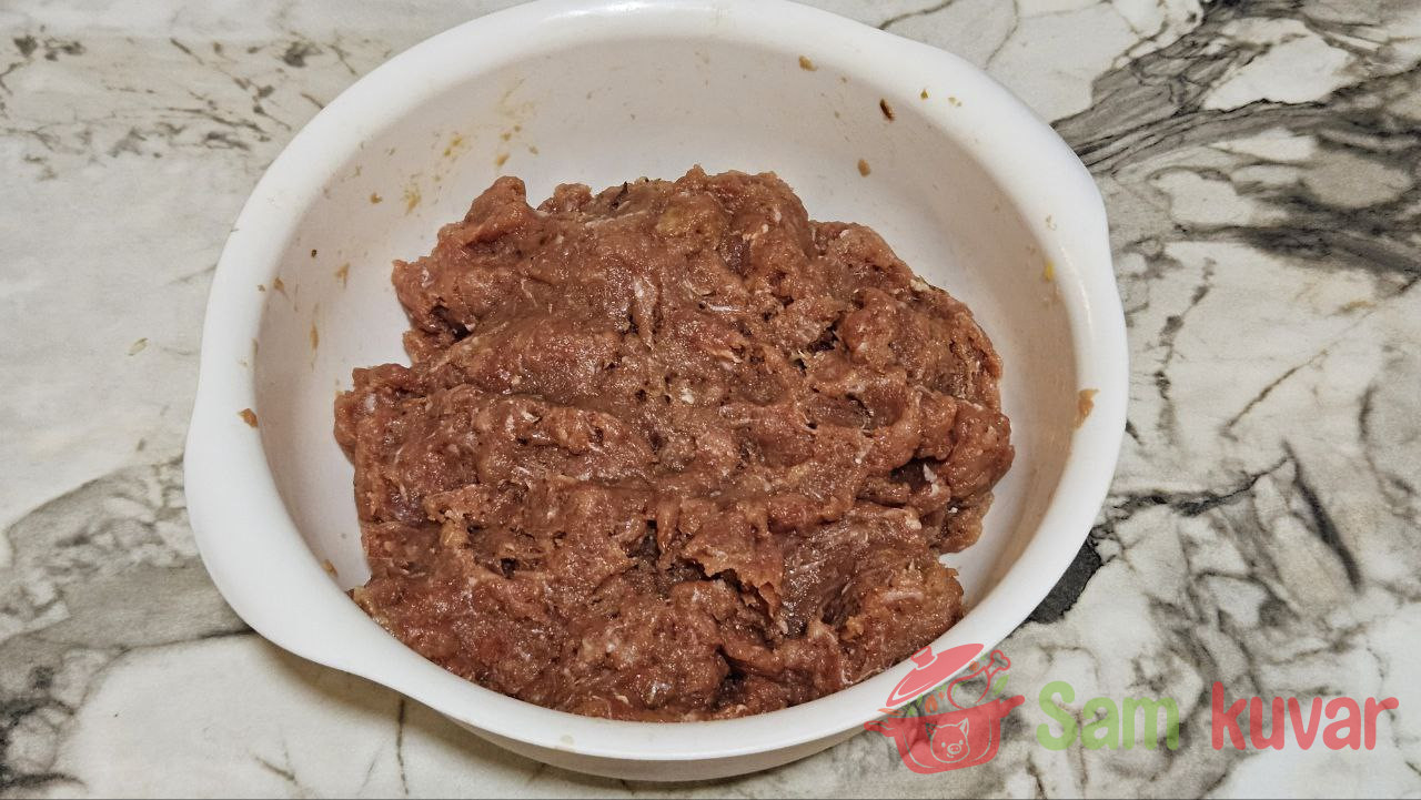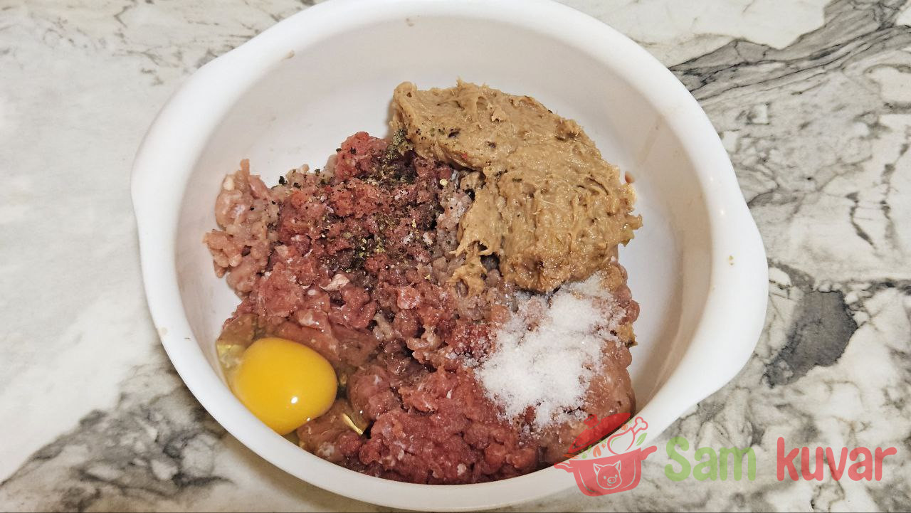 - U dublju posudu stavite mleveno juneće i svinjsko meso, samleveni luk s maslacem i jaje. Posolite i pobiberite po ukusu.