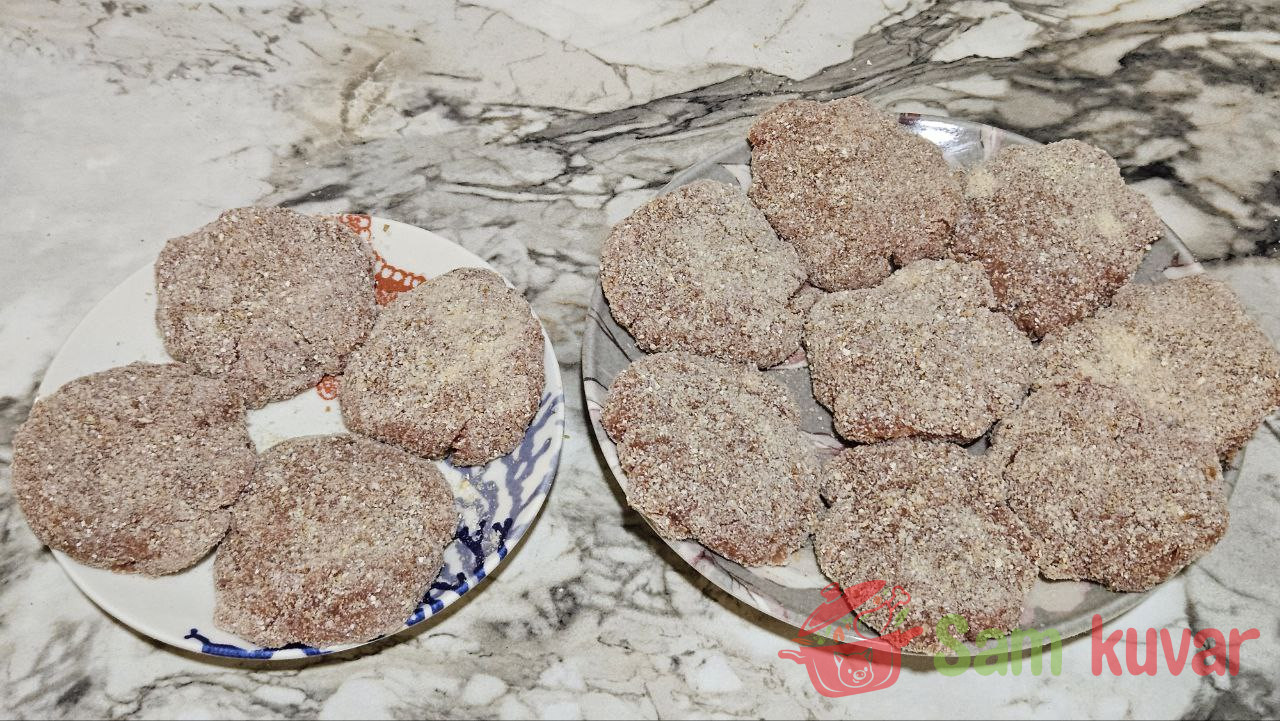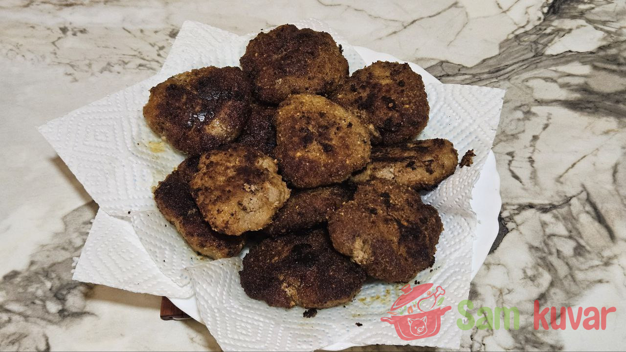 - Podelite smesu na 12 jednakih delova. Svaki deo nekoliko puta udarite o dasku kako bi masa postala vazdušastija. Zatim oblikujte kuglice, spljoštite ih i formirajte šnicle. Uvaljajte svaku u prezle.
