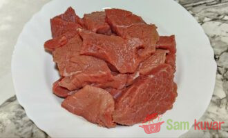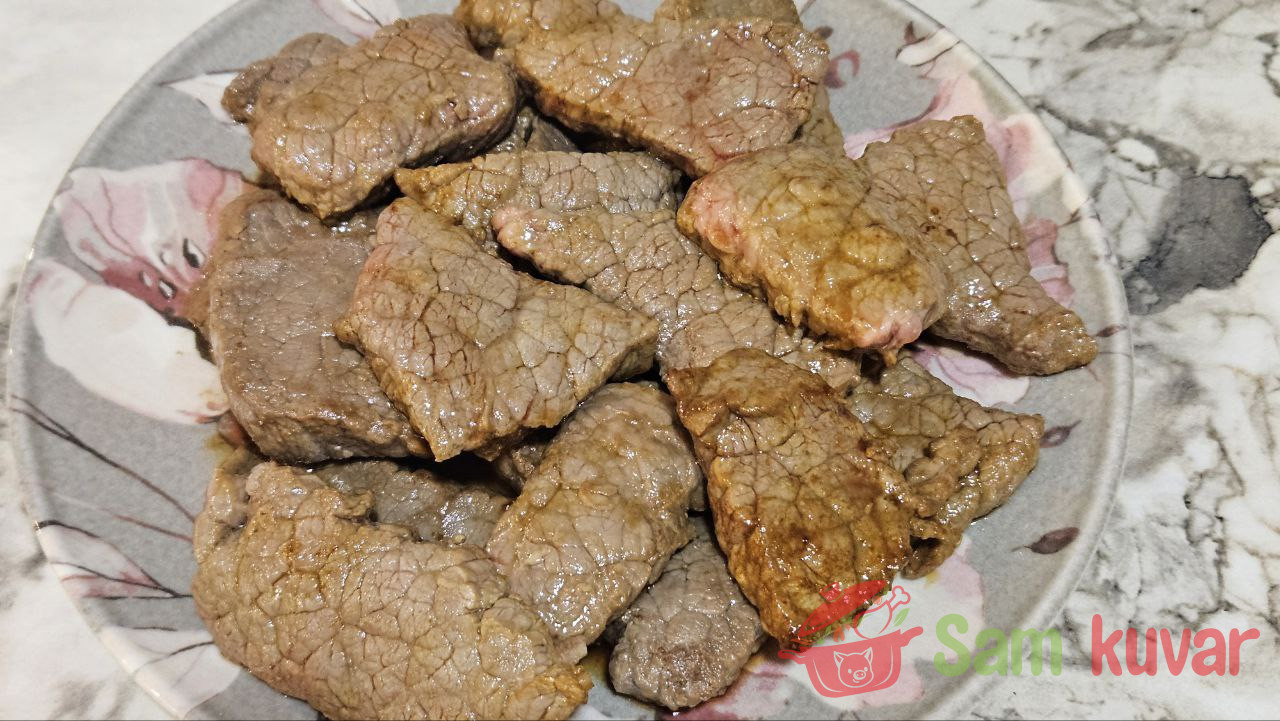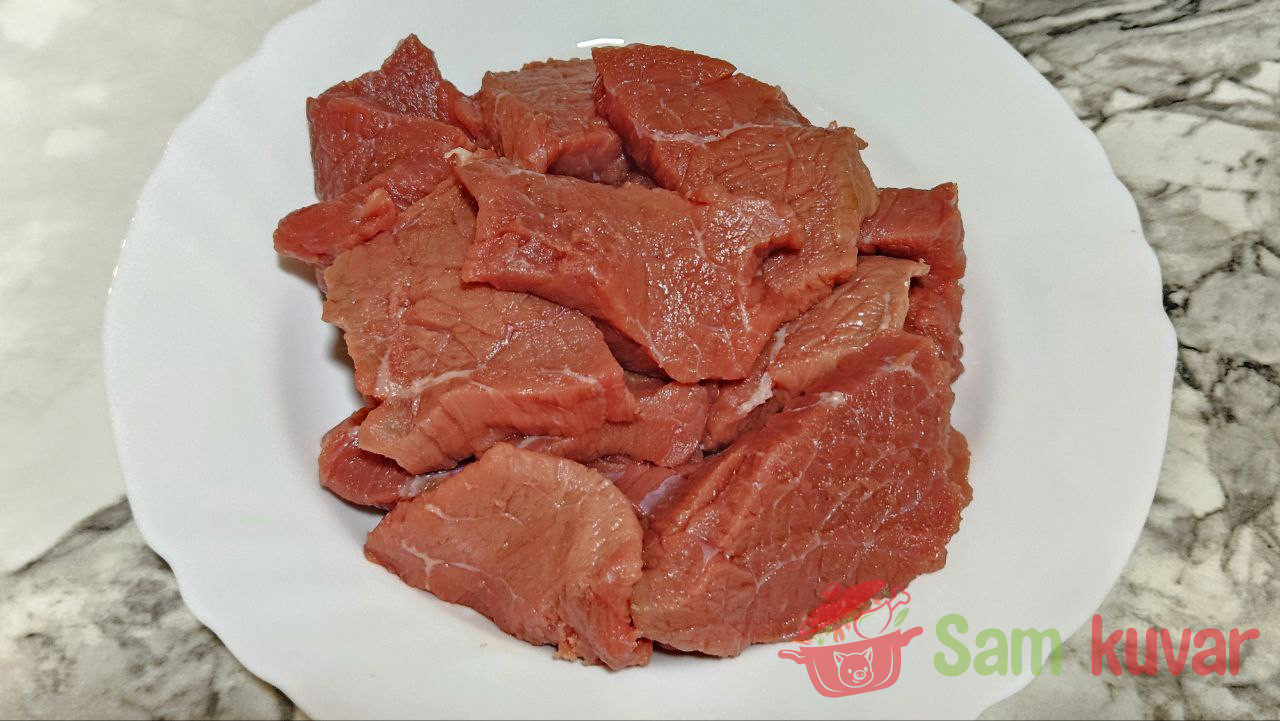 - Govedinu isecite na krupnije komade, debljine 1–1,5 cm. Blago posolite.