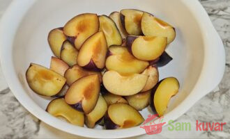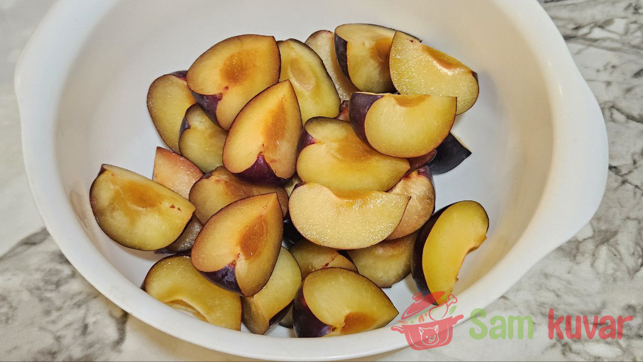 - Šljive isecite na četvrtine.