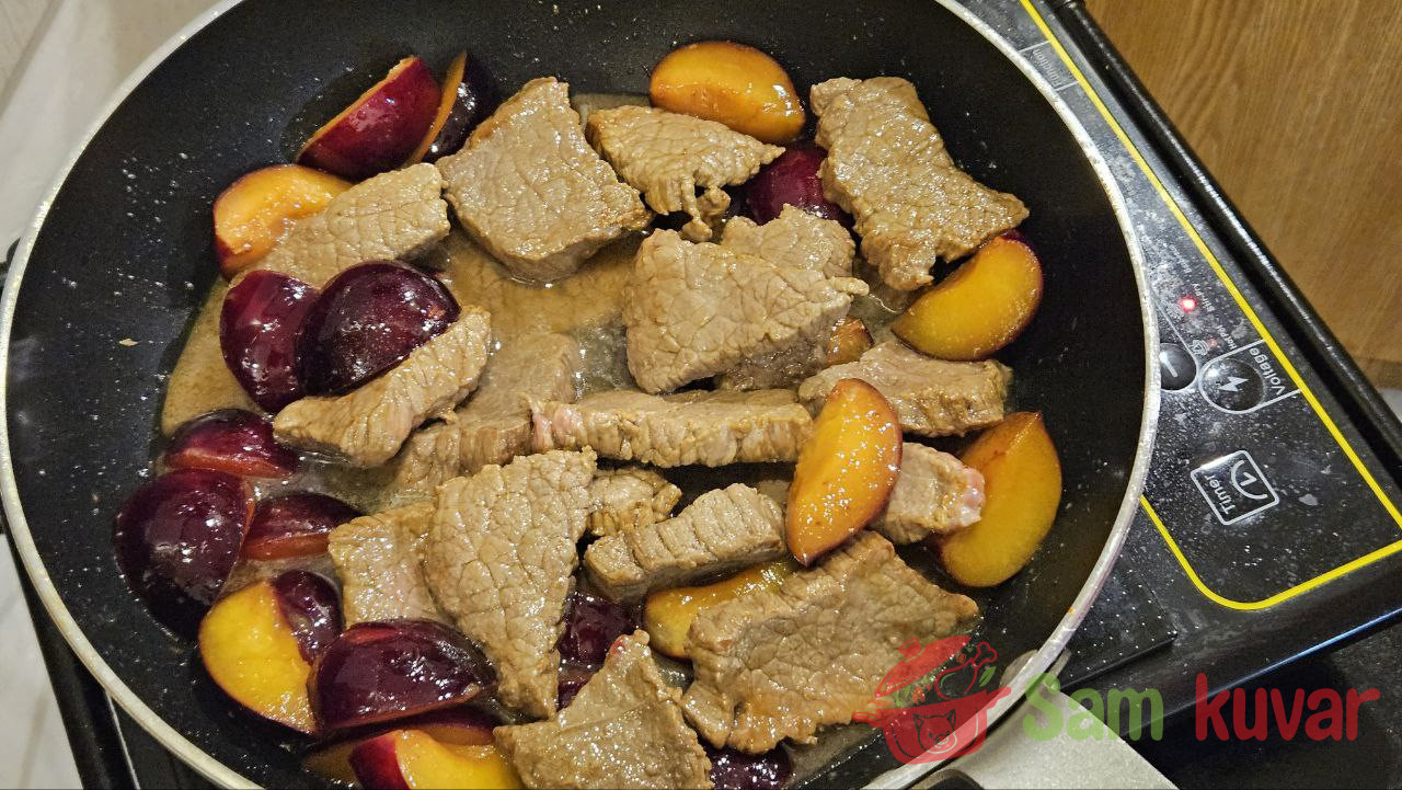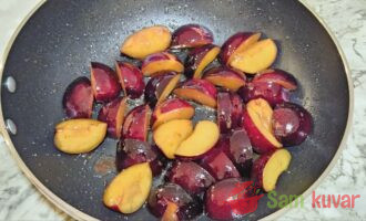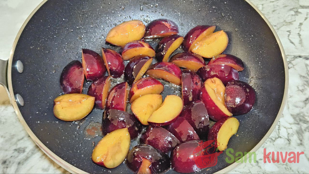- Na istom tiganju propržite šljive uz mešanje oko 5 minuta.