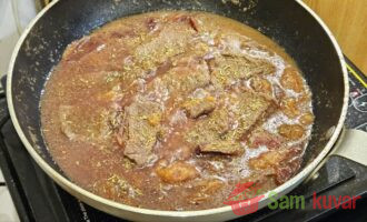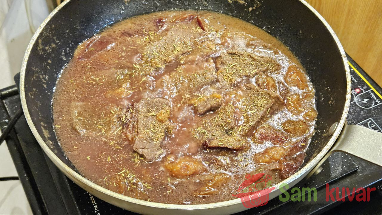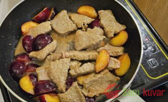 - Vratite meso u šljive, promešajte, dodajte vodu. Kada provri, smanjite vatru, poklopite i dinstajte 1 sat.