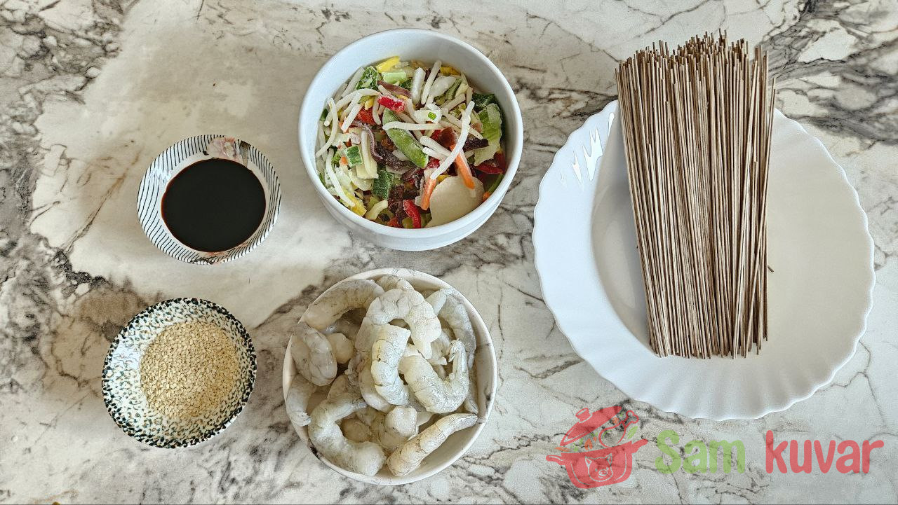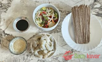 - Pripremite potrebne sastojke za heljdinu soba testeninu sa škampima.