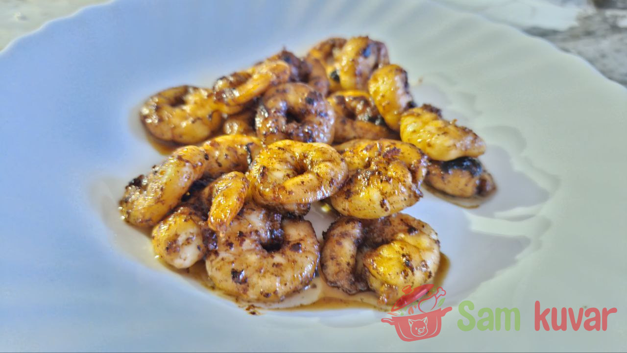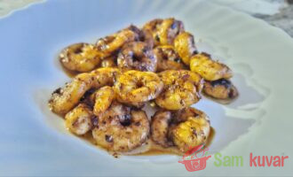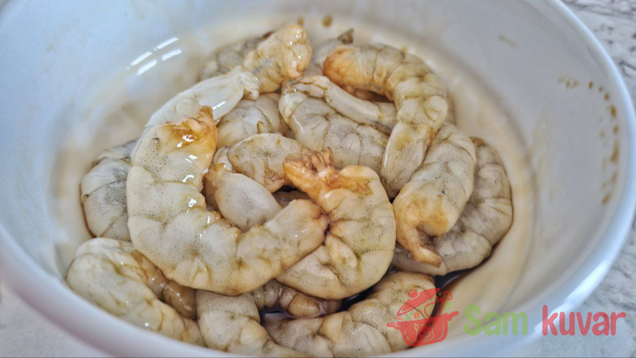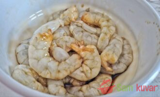 - Očistite škampe i marinirajte ih u 1/3 količine soja sosa oko 5 minuta.
