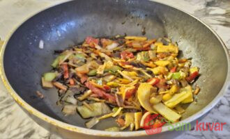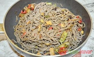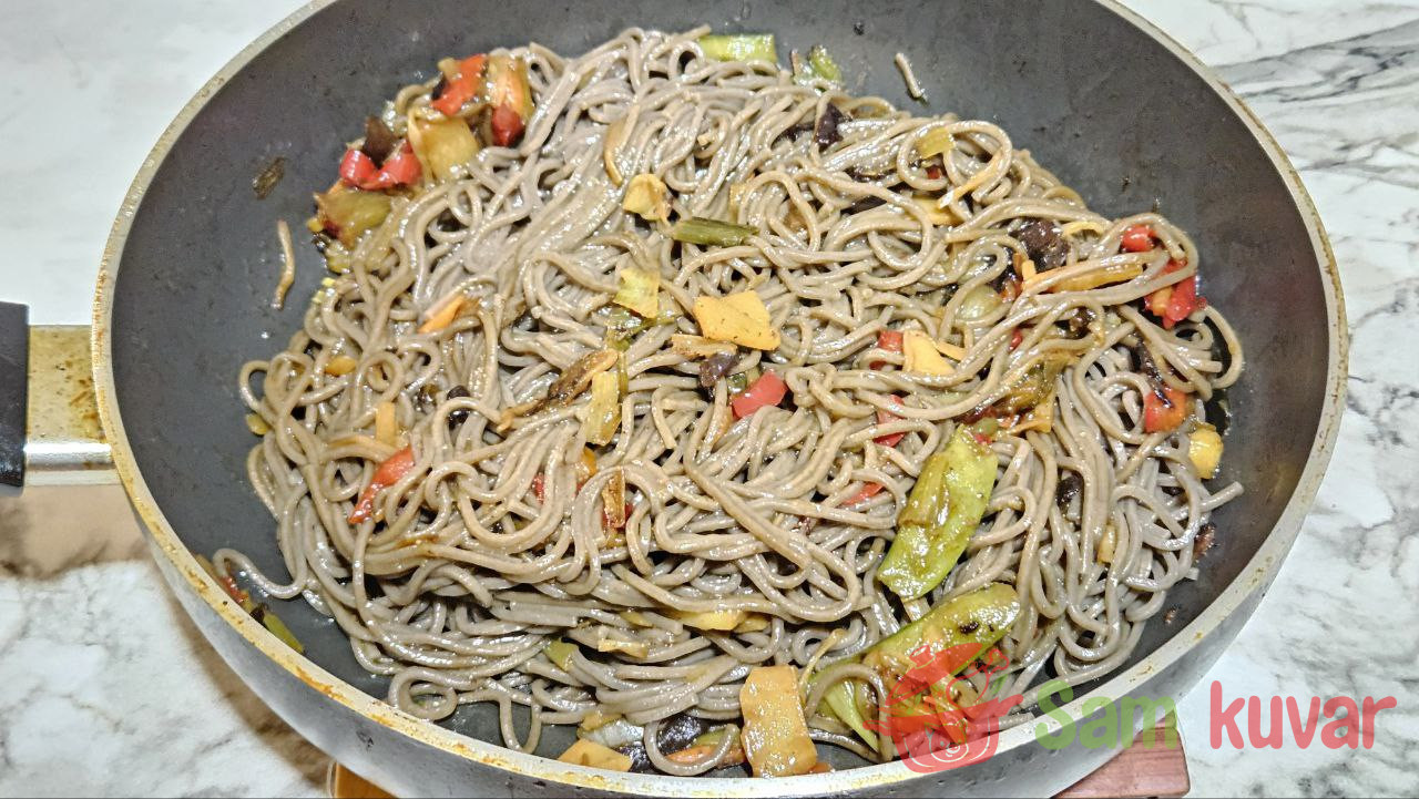 - Dodajte testeninu povrću i dobro promešajte. Pržite još 3 minuta uz mešanje.