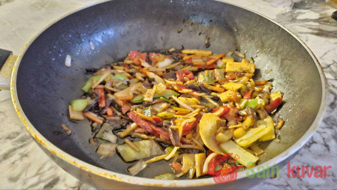 - Na istom tiganju nakon škampa propržite povrće do mekoće, dodajte još 1/3 soja sosa i malo terijaki sosa, pa dinstajte 3 minuta na blagoj vatri.