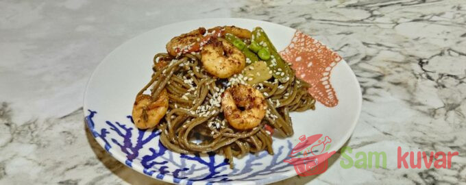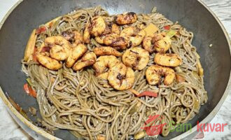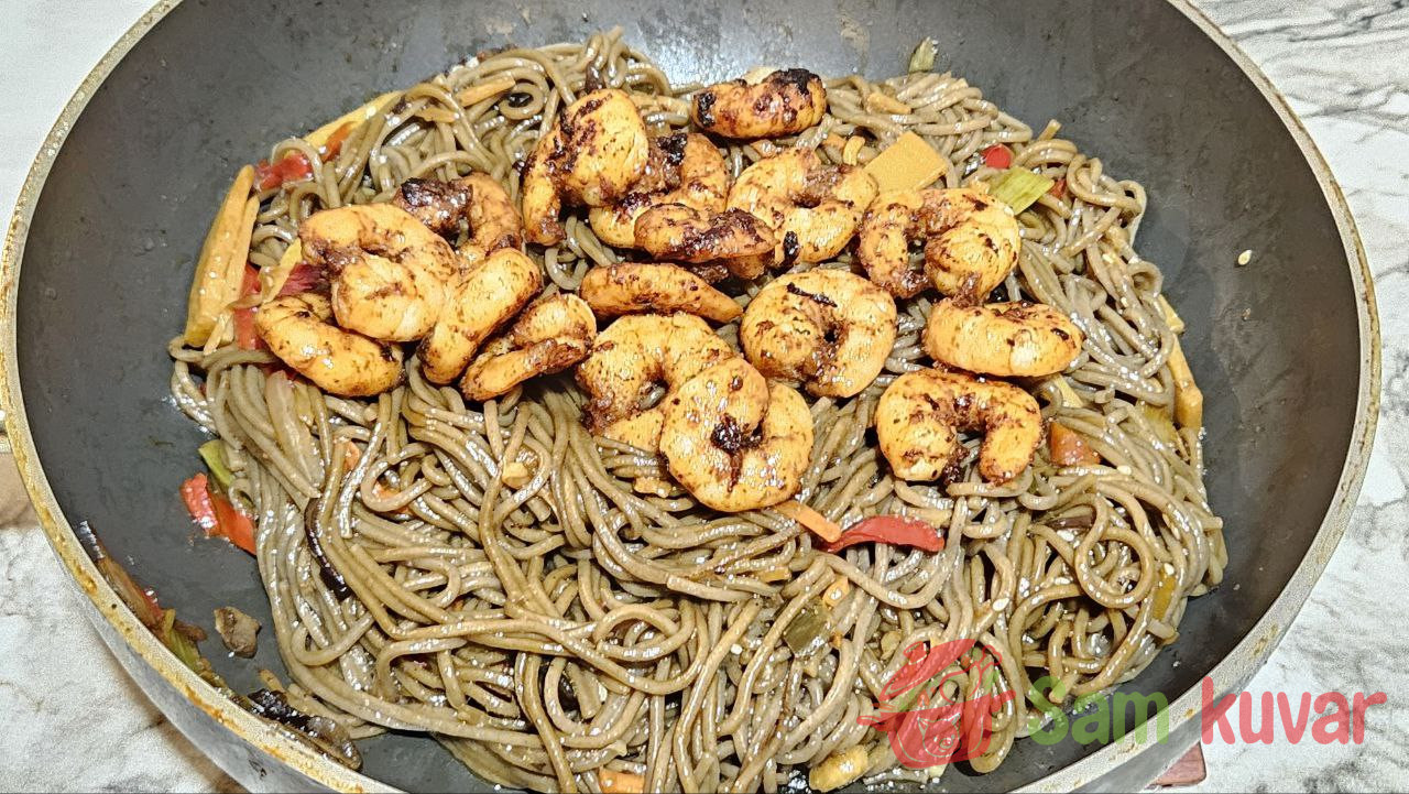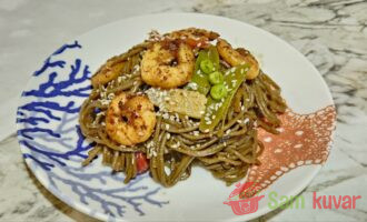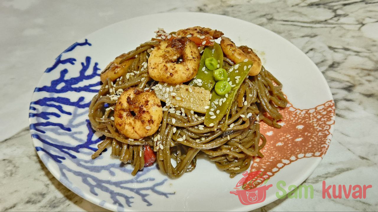 - Heljdina soba testenina sa škampima je gotova! Poslužite odmah, posute ostatkom susama. Prijatno!