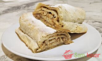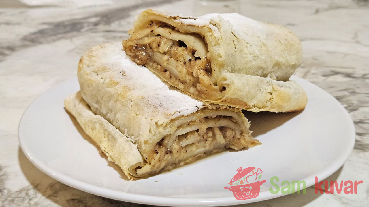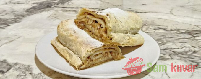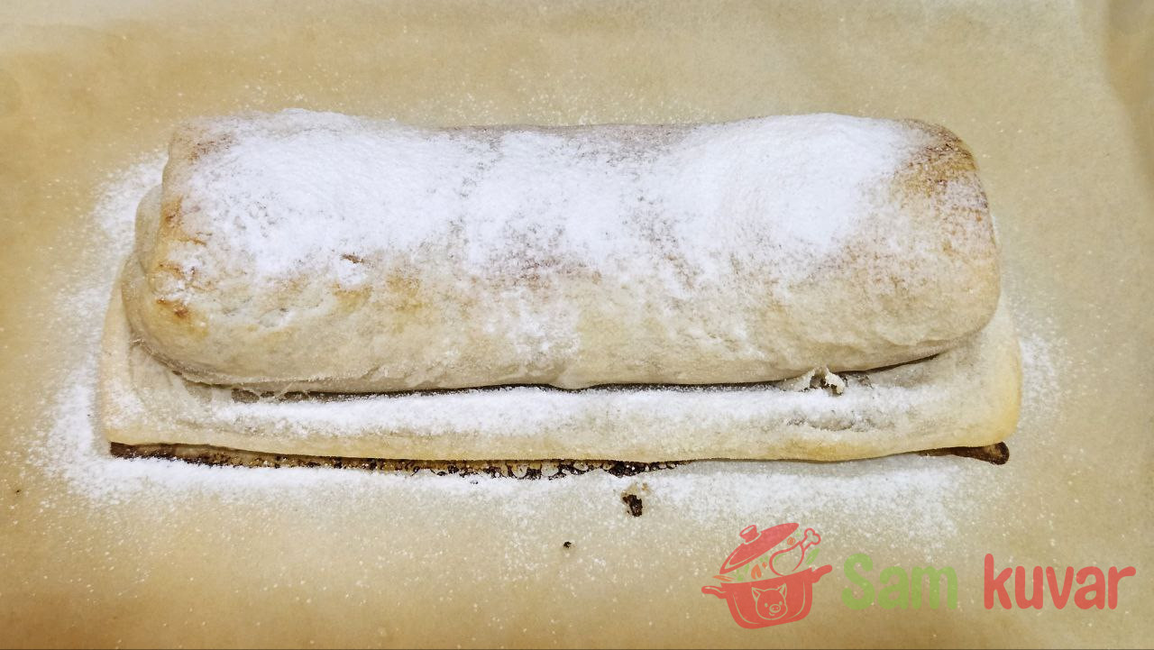 - Kada se štrudel ispeče, pospite ga šećerom u prahu.