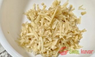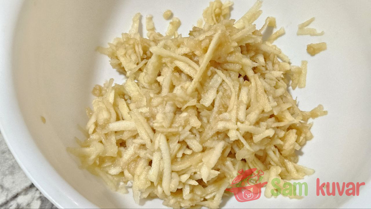 - Oljuštite jabuke i narendajte ih na krupno rende.