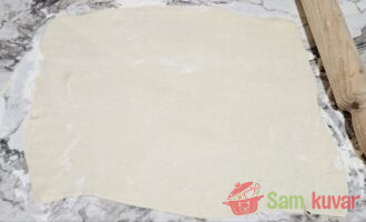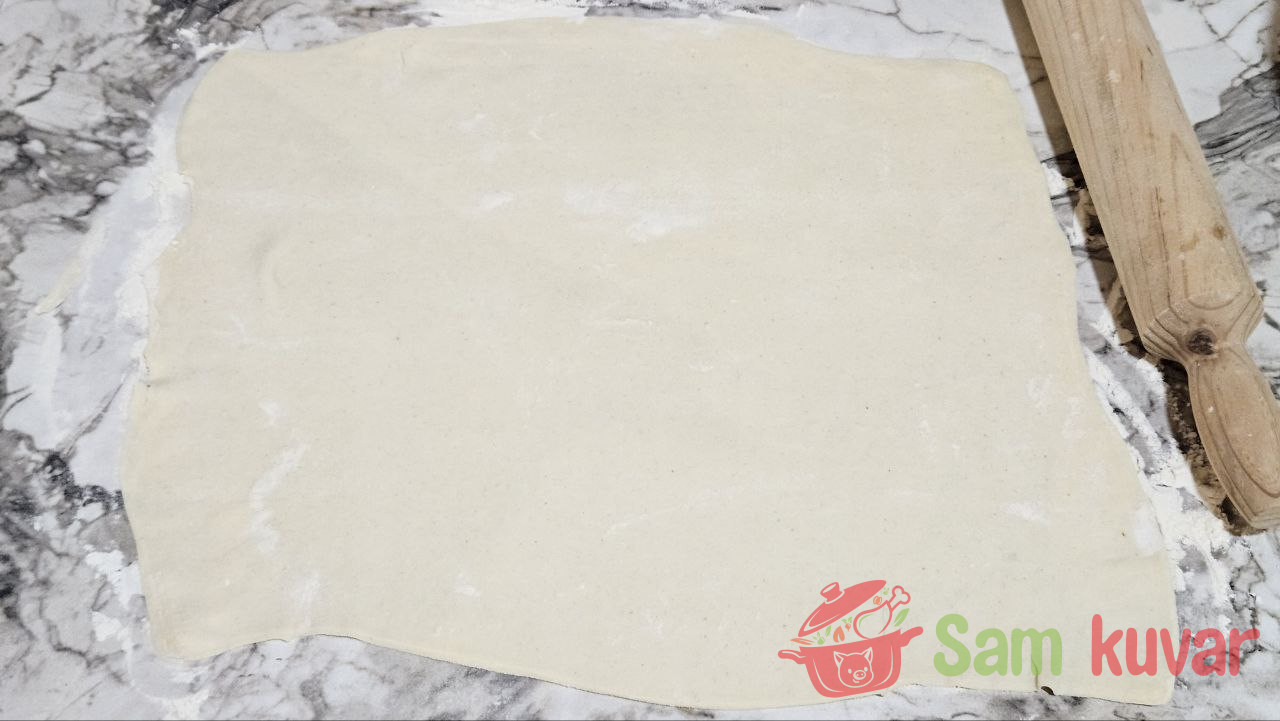 - Na površini posutoj brašnom tanko razvaljajte list testa.
