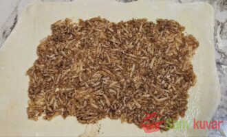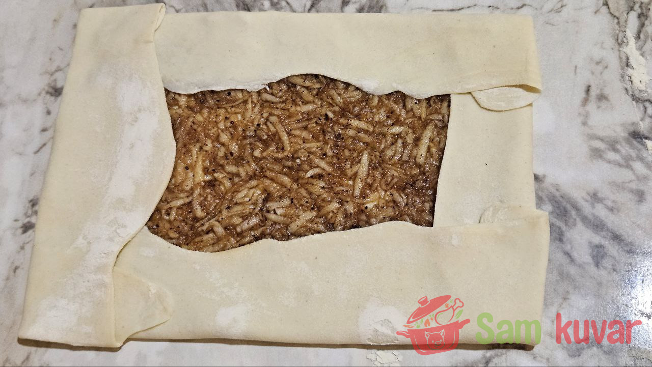 - Otopite maslac i premažite njime testo. Preko rasporedite jabuku sa šećerom i cimetom, ostavljajući ivice slobodne.