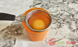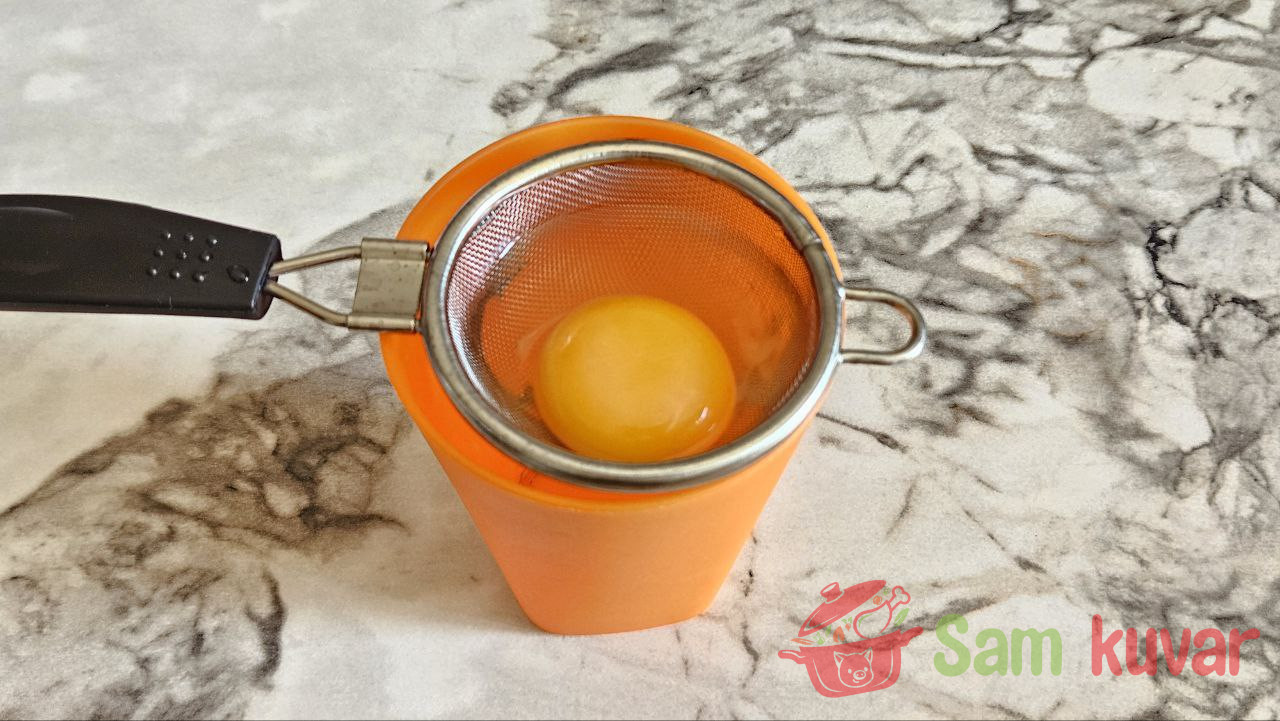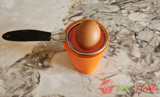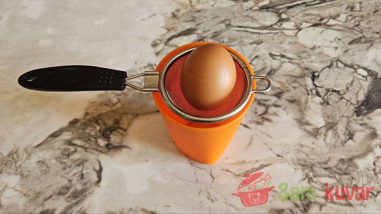 - Operite jaje i pripremite cediljku u koju može da stane jaje.