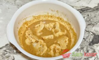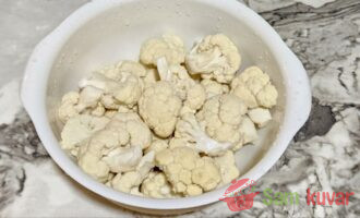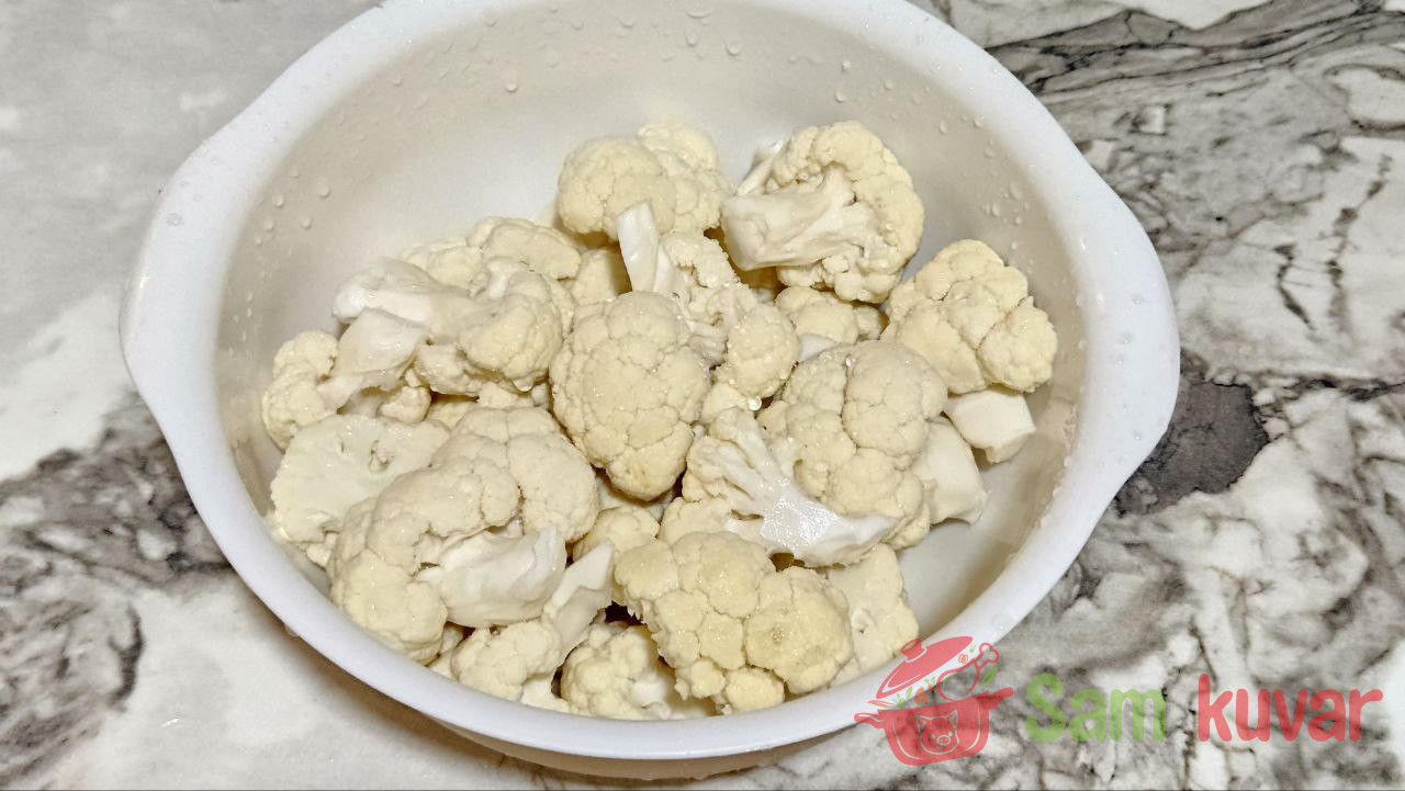 - Očistite karfiol i podelite ga na cvetove. Veće cvetove možete preseći nožem. Kuvajte u posoljenoj kipućoj vodi 10–15 minuta, u zavisnosti od veličine cvetova. Kada je karfiol skuvan, ocedite vodu i ostavite ga da se malo ohladi.