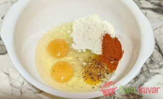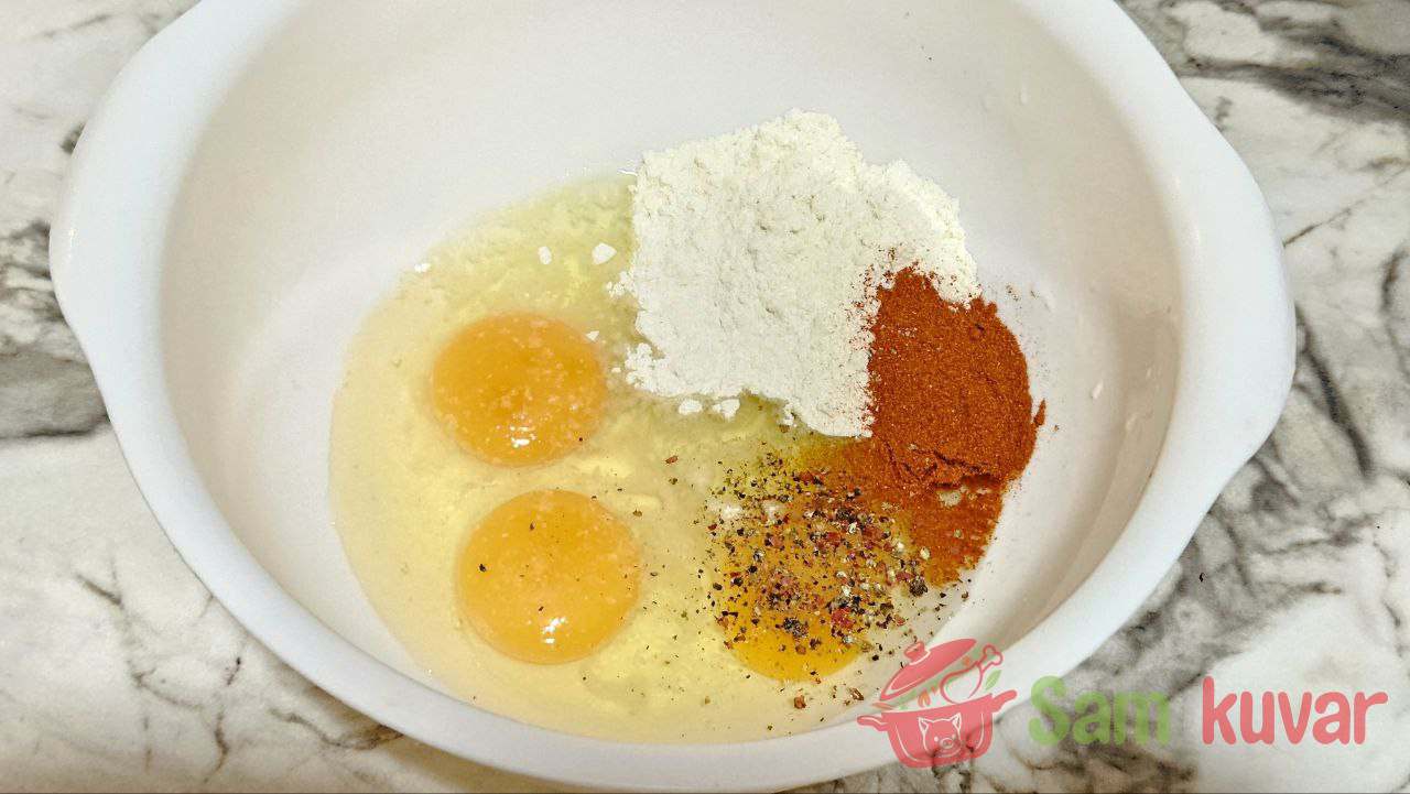 - Dok se karfiol kuva, pripremite testo. U činiju razbijte jaja, posolite, pobiberite, dodajte malo brašna, sušenu papriku i čili.