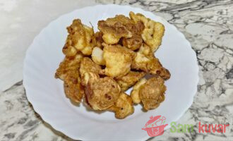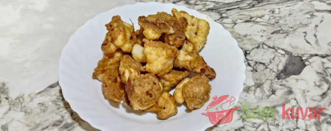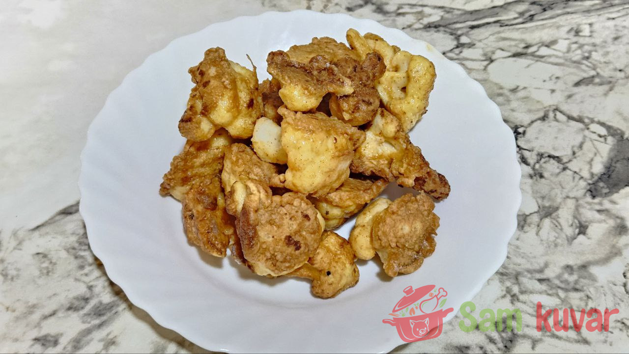 - Pržite karfiol u testu sa svih strana dok ne dobije zlatnu koricu, oko 1–2 minuta sa svake strane. Nastavite dok ne potrošite sav karfiol.