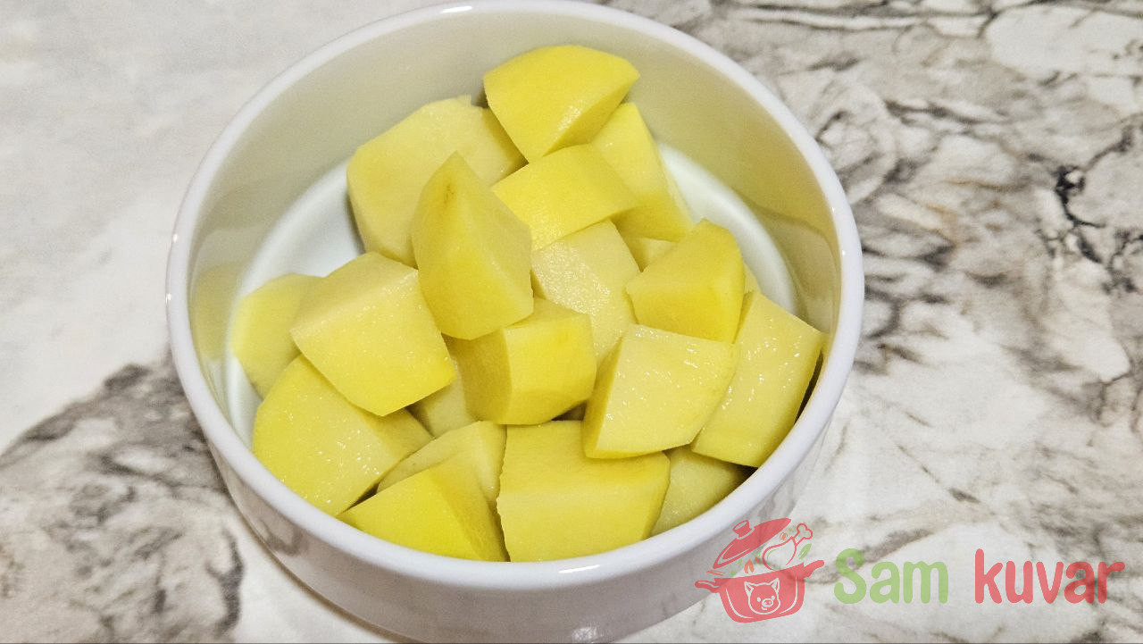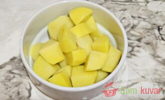 - Krompir oljuštite, krupno isecite i skuvajte u posoljenoj vodi.