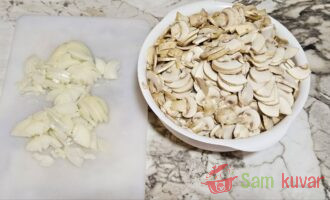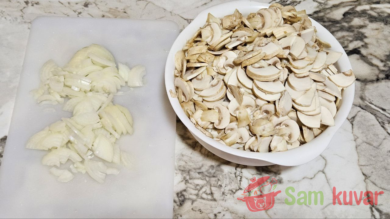 - Dok se krompir kuva, luk isecite na četvrtine kolutova, a pečurke na listiće.