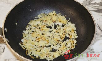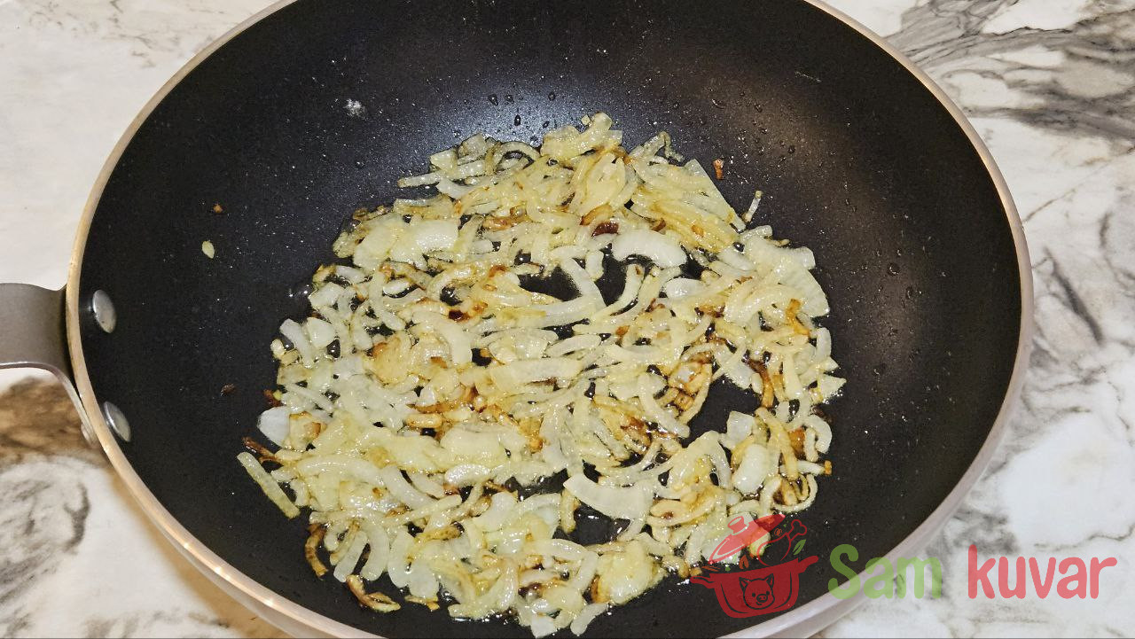 - Na biljnom ulju propržite luk dok ne dobije zlatnu boju.