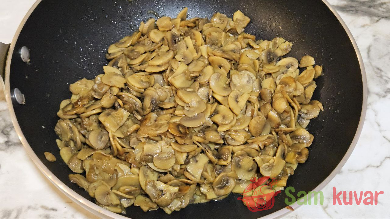 - Dodajte pečurke luku i pržite dok ne ispari sva tečnost iz pečuraka. Posolite i pobiberite po ukusu.