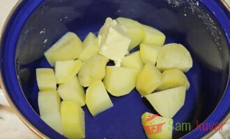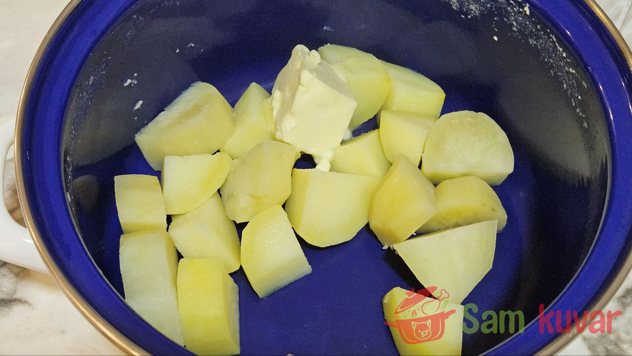 - Kada se krompir skuva, ocedite vodu u posebnu posudu, ali je nemojte bacati. U krompir dodajte puter.