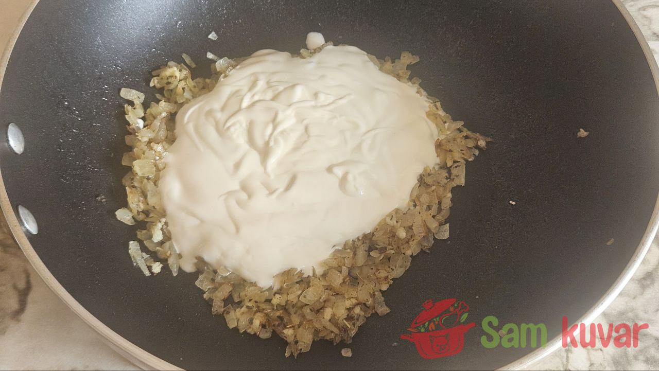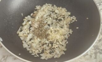 - Dodajte pavlaku u tiganj, promešajte sa lukom i dovedite do ključanja.