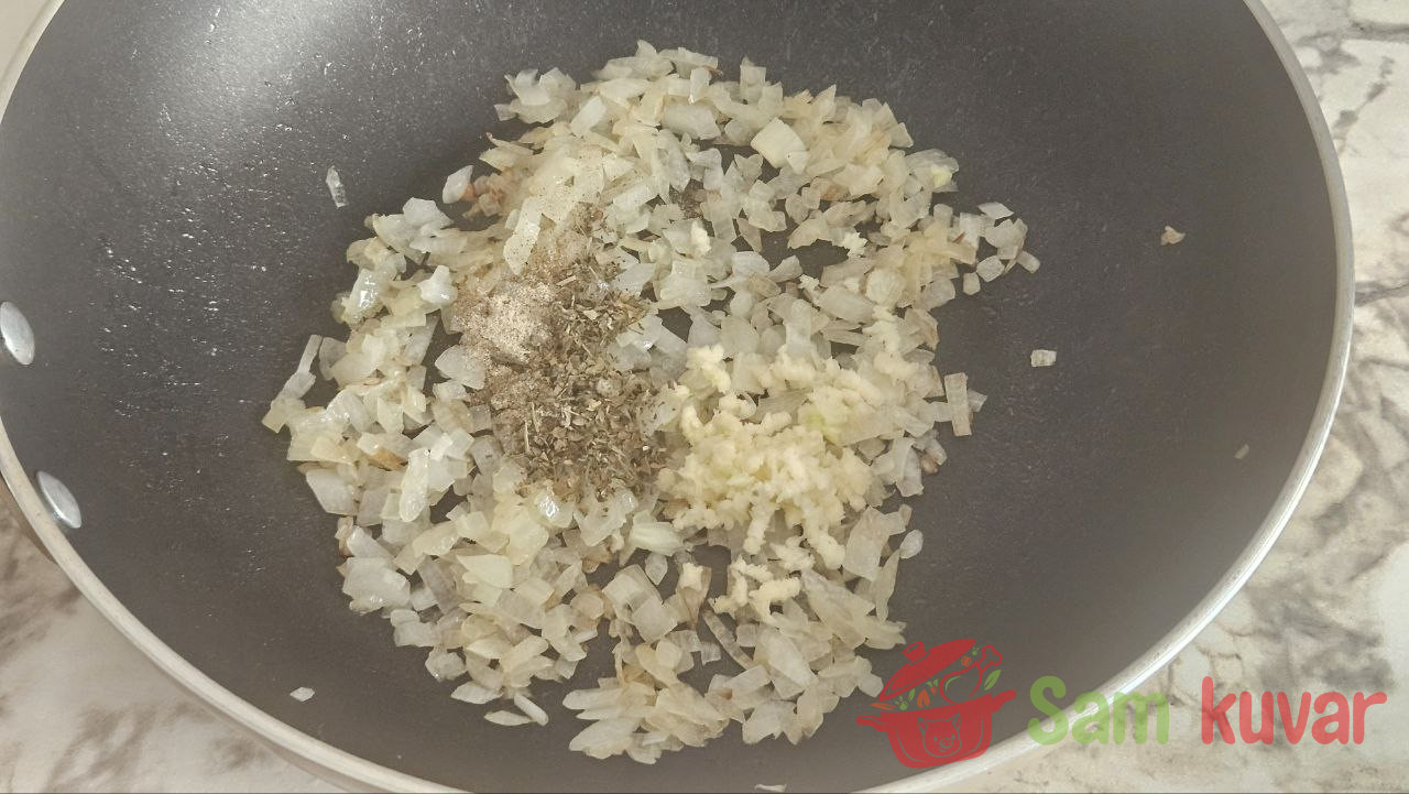 - Dok se prokelj kuva, u dubokom tiganju otopite maslac i propržite sitno seckani luk dok ne postane staklast. Dodajte beli luk protisnut kroz presu, bosiljak i crni biber, malo posolite i pržite još 2 minuta.