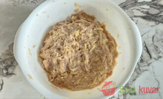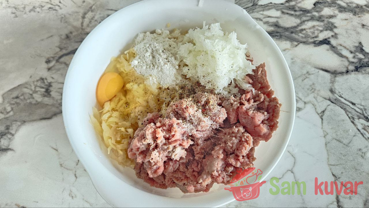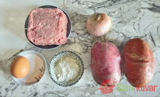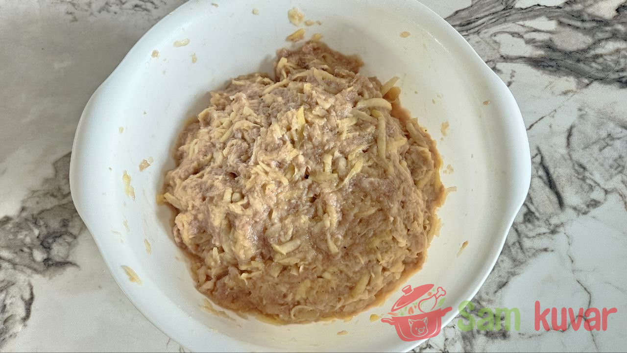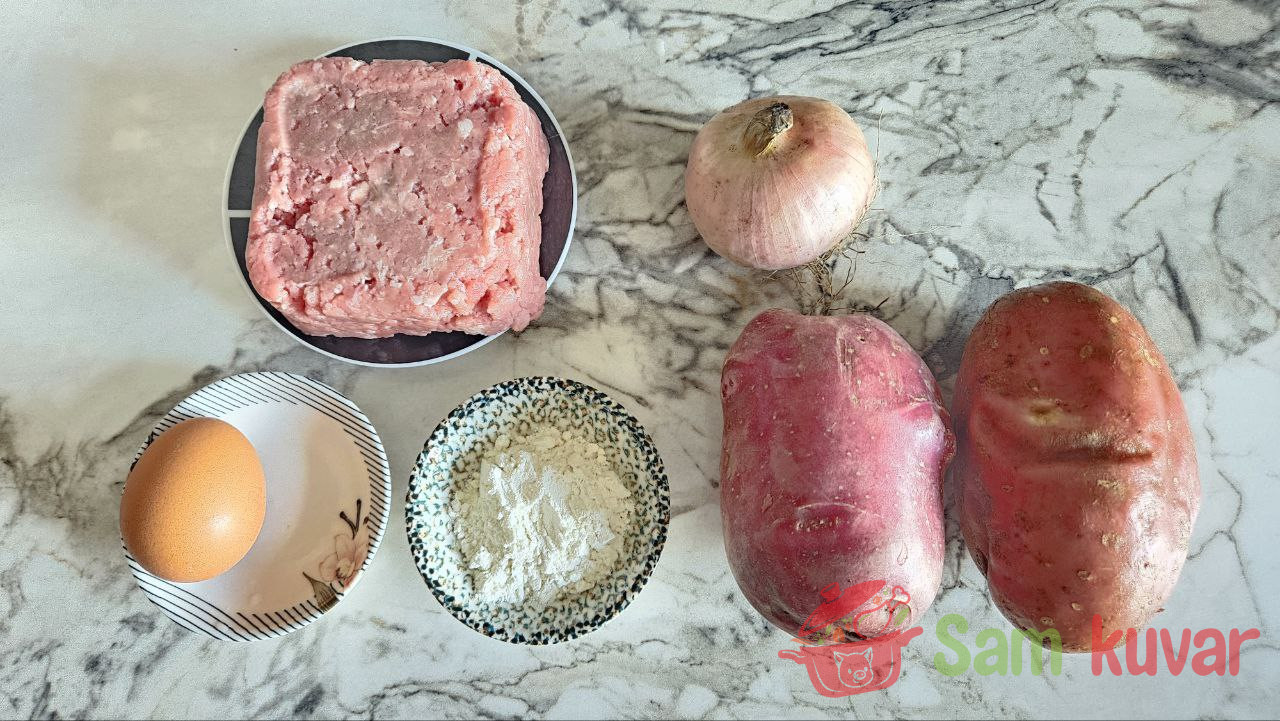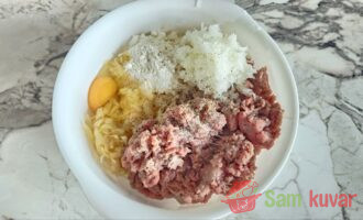 - U narendani krompir dodajte mleveno meso, narendani luk, jaje i brašno. Posolite i pobiberite.