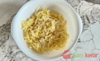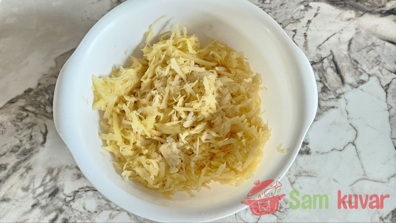 - Oljuštite krompir i izrendajte ga na krupno rende. Iscedite višak tečnosti iz narendanog krompira.