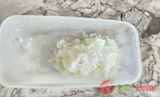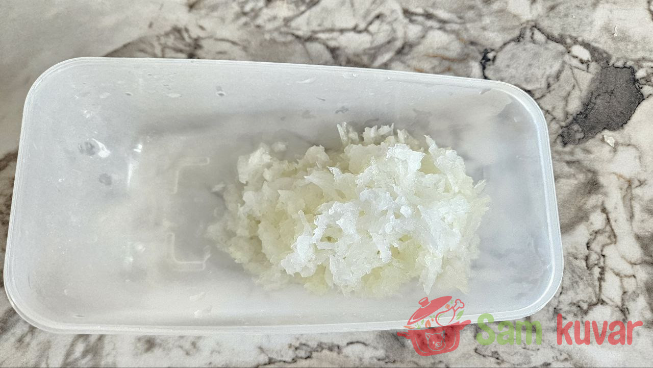 - Oljuštite luk i izrendajte ga na sitno rende.