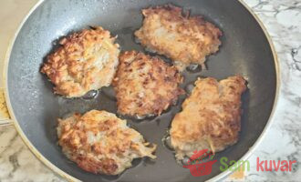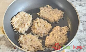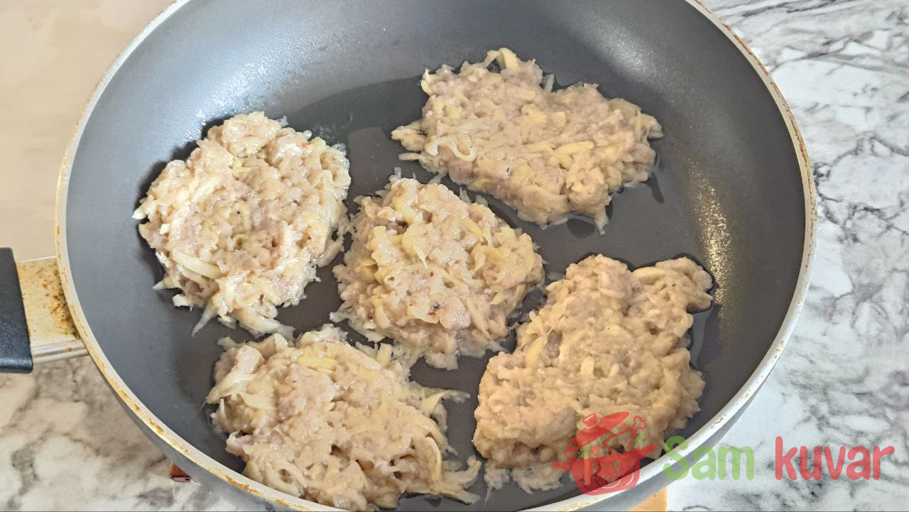 - Pržite pljeskavice sa svake strane 5–7 minuta pod poklopcem, da se meso ispeče i da dobiju zlatno-rumenu koricu. Ispržite na isti način sve pljeskavice, dodajući ulje po potrebi, dok se smesa ne potroši.
