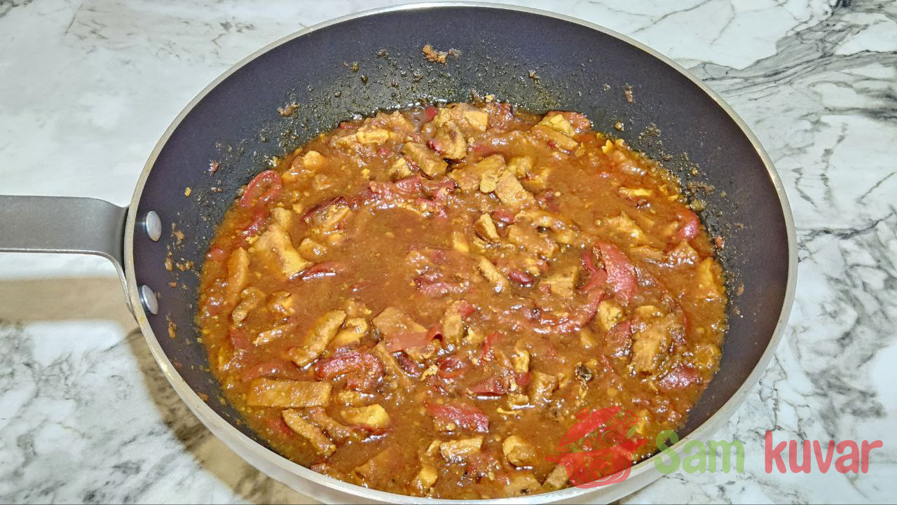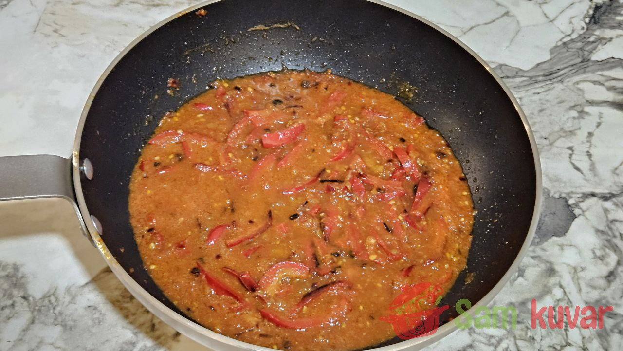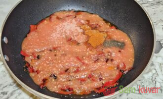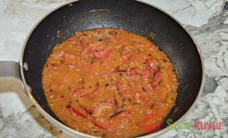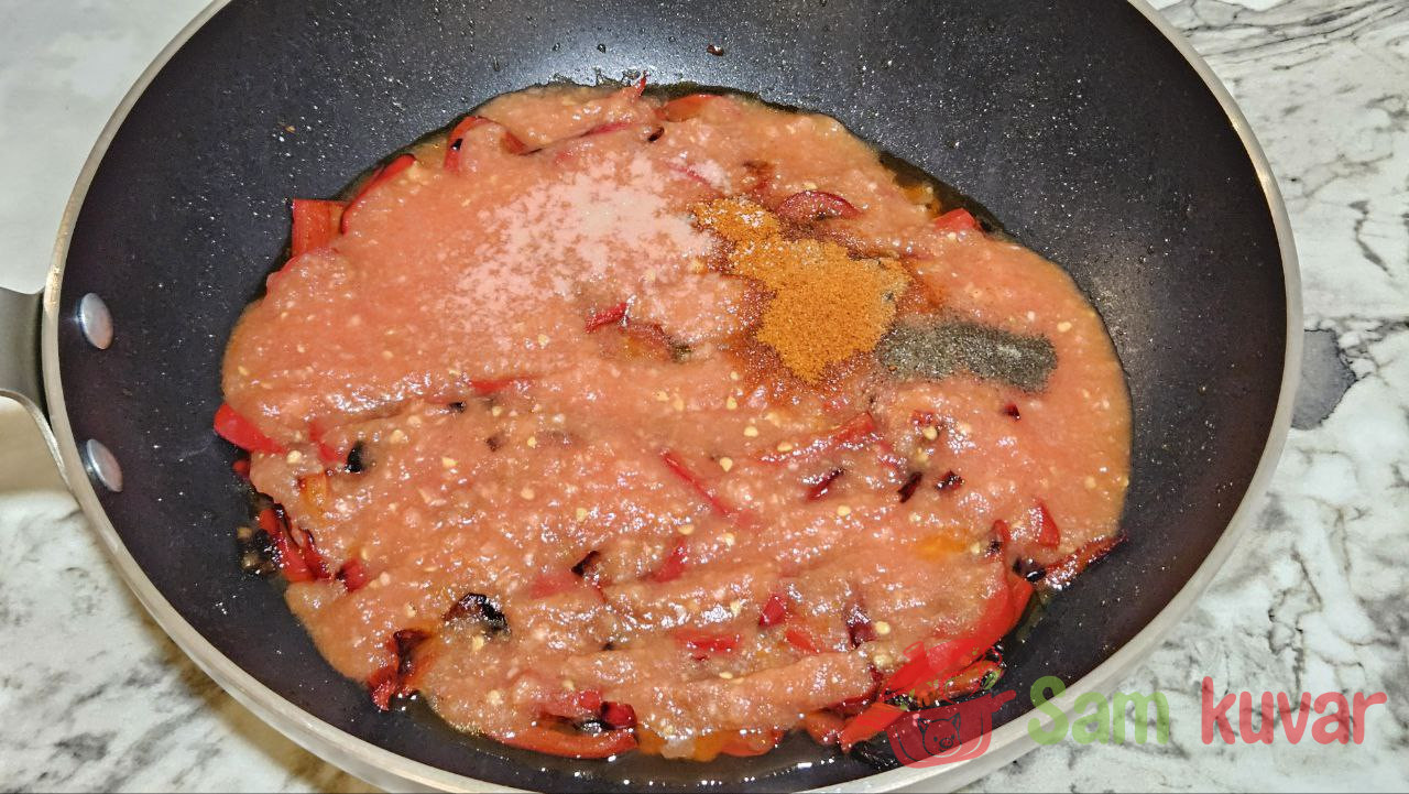 - U tiganj sa povrćem dodajte paradajz, mleveni crni biber i suvu papriku. Posolite.