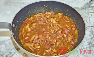 - Sve dobro promešajte i dinstajte još 15 minuta, povremeno mešajući. Ako je masa pregusta, dodajte malo hladne vode.