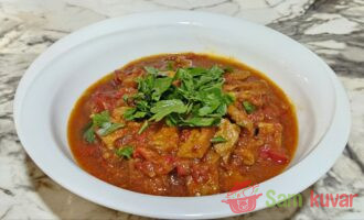 - Dobro promešajte i dinstajte pod poklopcem još 20 minuta. Poslužite toplo, posuto seckanim peršunom. Prijatno!