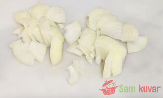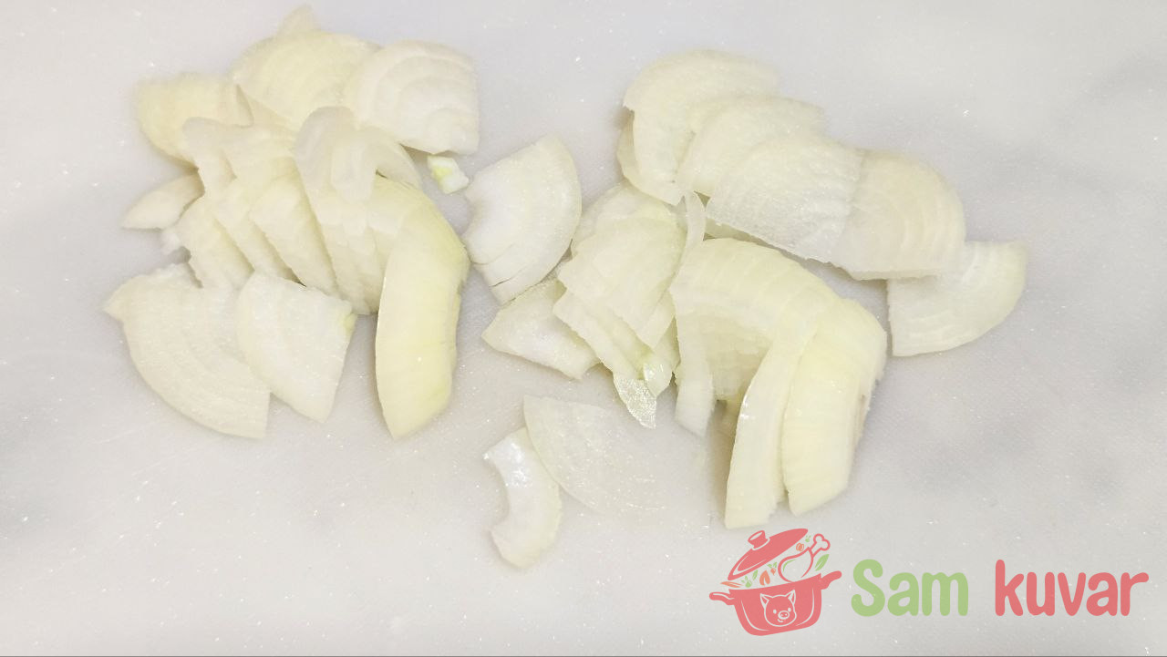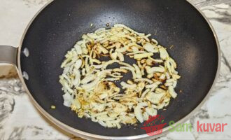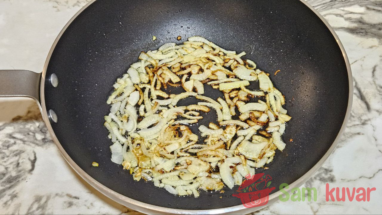 - Na zagrejan tiganj sa malo ulja stavite luk i pržite dok ne postane zlatne boje.