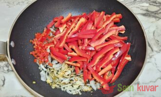 - Dodajte papriku i ljutu papriku, promešajte i poklopite. Dinstajte na tihoj vatri 15 minuta.