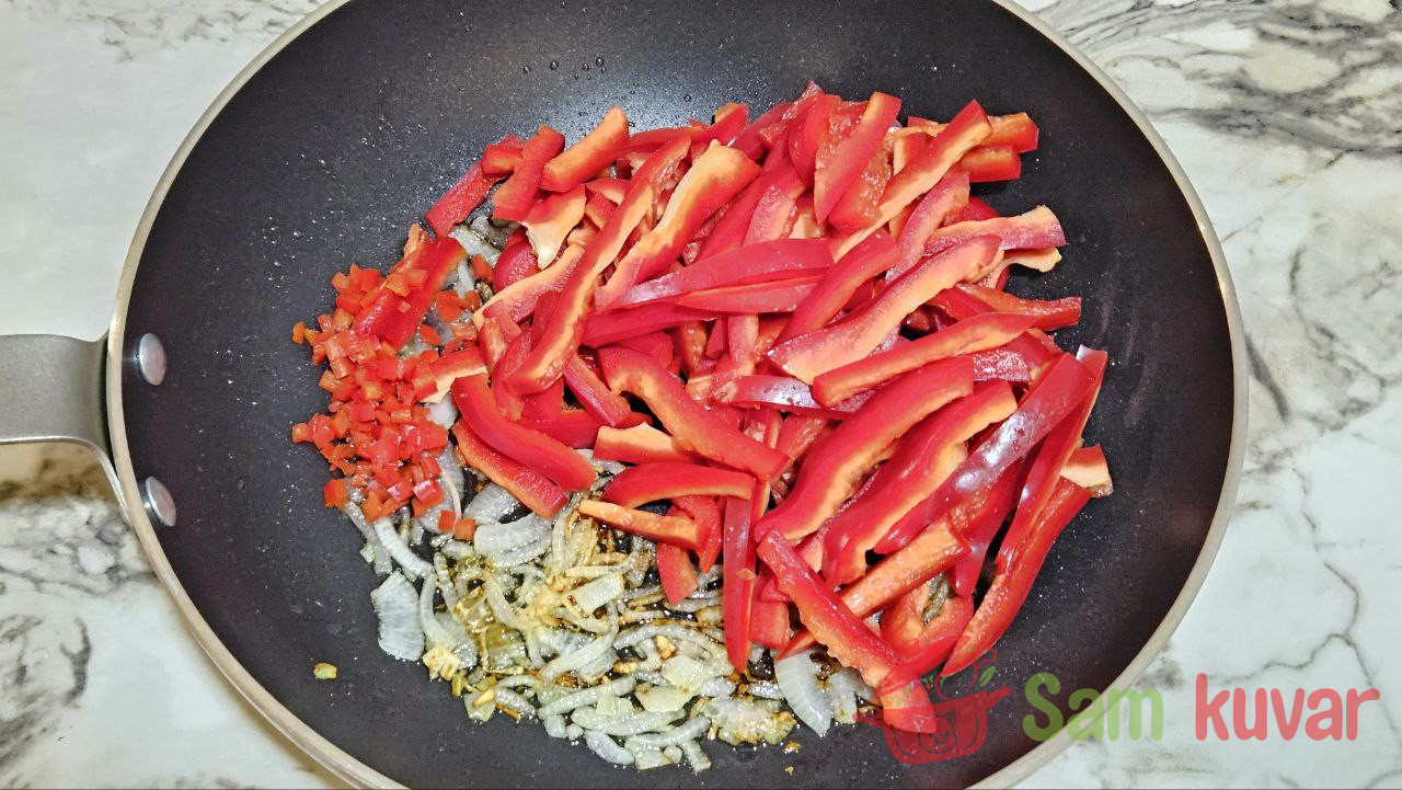 - Crvenu papriku isecite na trake, a ljutu papriku sitno naseckajte.