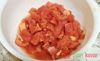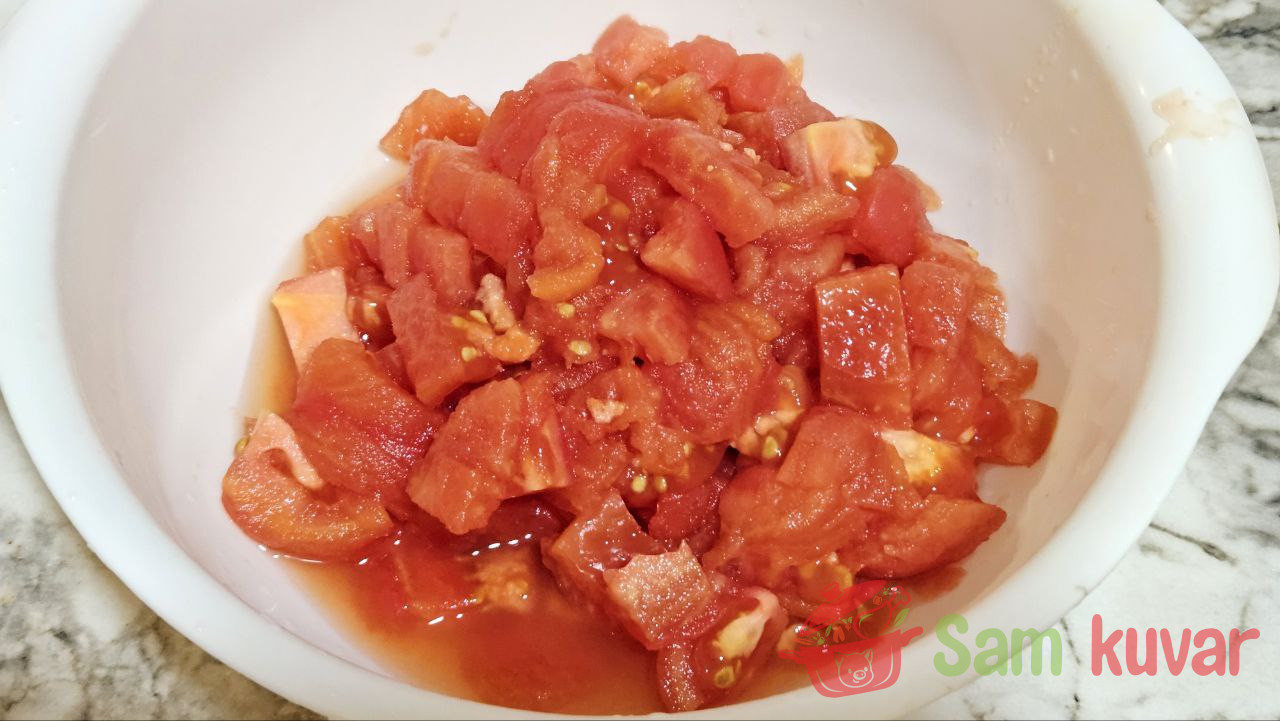- Dok se povrće dinsta, pripremite paradajz. Oljuštite ga tako što ćete ga staviti u kipuću vodu na 5 minuta – tada se kožica lako skida.